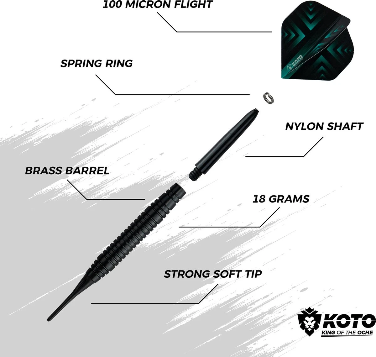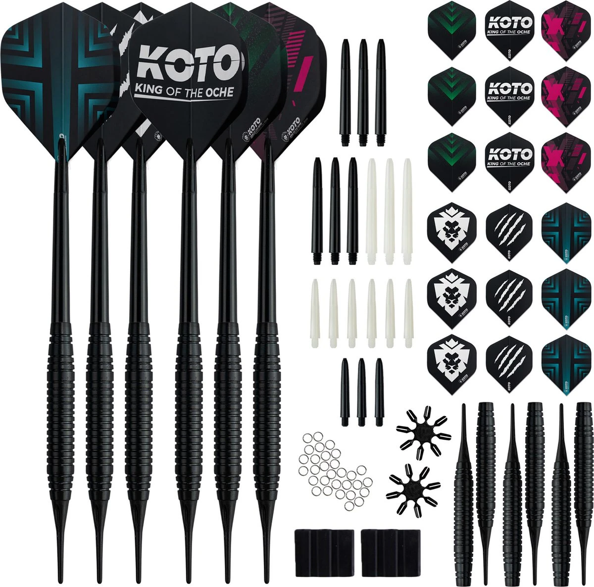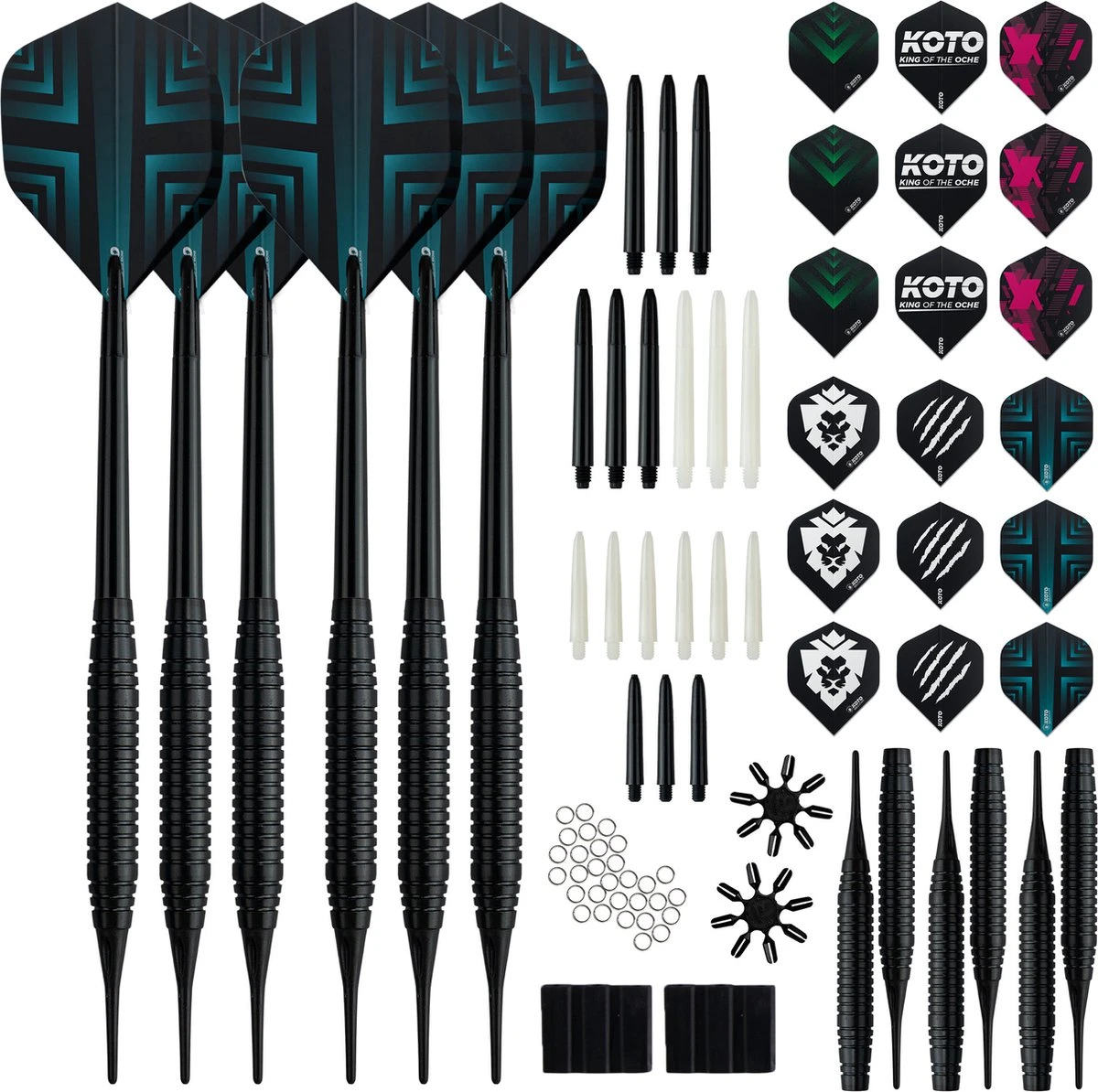Complete set soft dartpijlen: De 2 KOTO Black Brass Soft Tip Darts + 90 Accessoires – Dartpijlen – Voor Elektronische Dartborden wordt geleverd als complete set. De set bestaat uit 6 barrels, 6 sets KOTO flights met logo, 6 sets KOTO shafts en 2 punthouders.