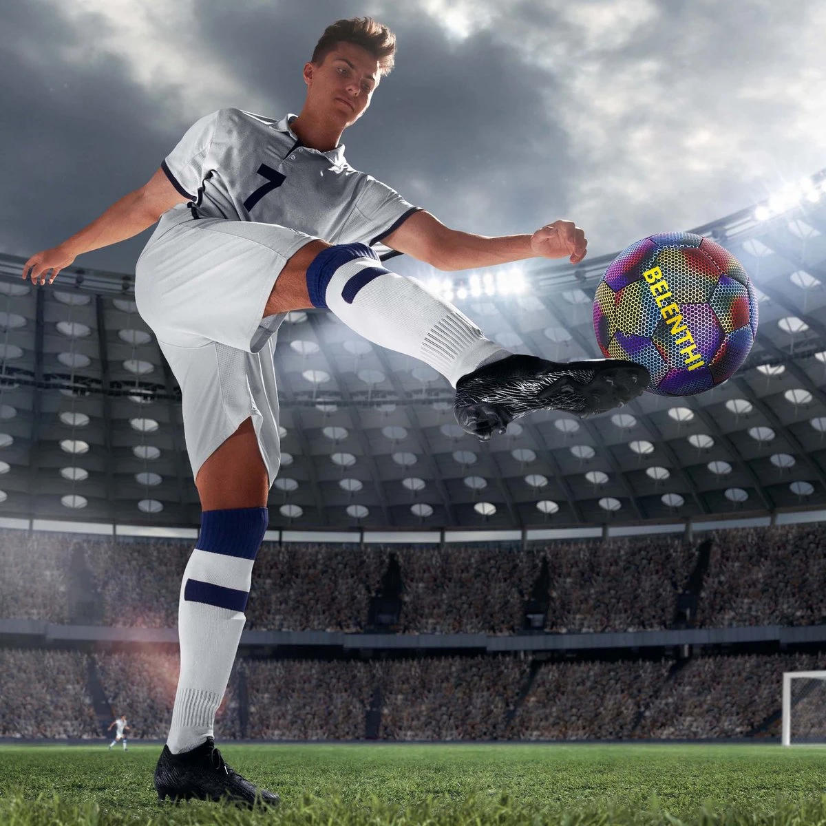 De BRIGHT voetbal is gemaakt van hoog kwaliteit reflecterend leer met een holografisch effect en heeft het gevoel en de veerkracht van een normale voetbal. De bal lijkt zwart wanneer het helemaal donker is en er geen licht op geschenen wordt, maar wanneer je een foto/video met flits maakt geeft de bal licht op je telefoonscherm.