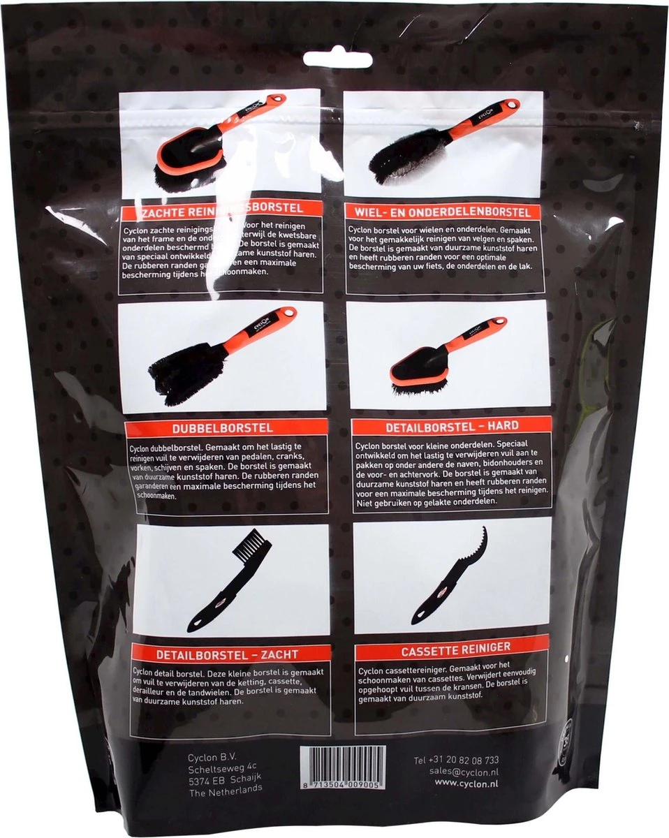 De Cyclon Brush Kit borstelset is een geweldig assortiment borstels om te gebruiken bij het schoonmaken van je racefiets of mountainbike. Kwalitatief duurzame borstels die tegen warm water kunnen en niet snel kapot gaan. Zachte haren op het uiteinde van de grote borstel om de lak van je frame niet te beschadigen. Detailborstel om op lastige plekken te komen tussen de voor- en achtervork of achter de derailleurs op het frame. Wielborstels voor op de velgen en tussen de spaken, en op de naven. De overige borstels zijn om de ketting en cassette schoon te maken.