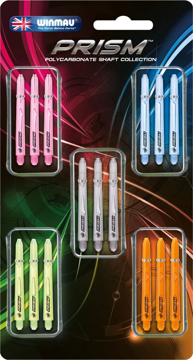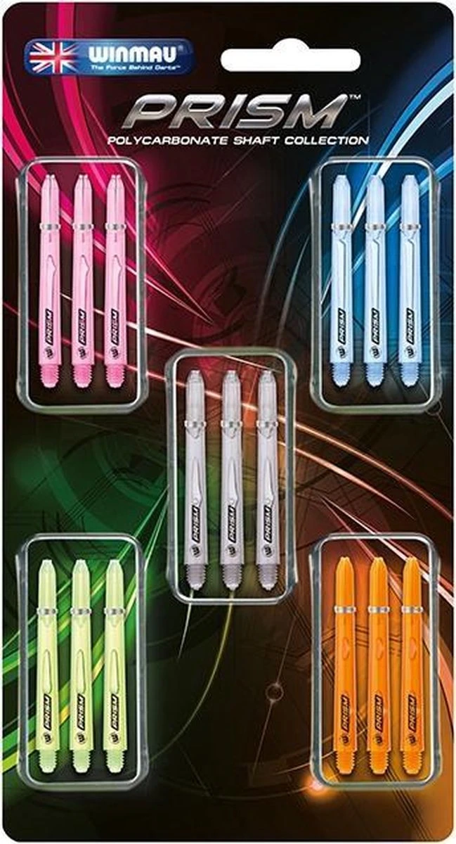 Winmau heeft een nieuw materiaal ontwikkeld dat een opmerkelijke verzameling aan kwaliteiten biedt, zoals ongeëvenaarde sterkte, uitstekende dimensionale stabiliteit, een uitstekende slagvastheid en superieure transparantie. Deze set bestaat uit 5×3 shafts in verschillende kleuren. Kleuren en lengtes kunnen varieren.