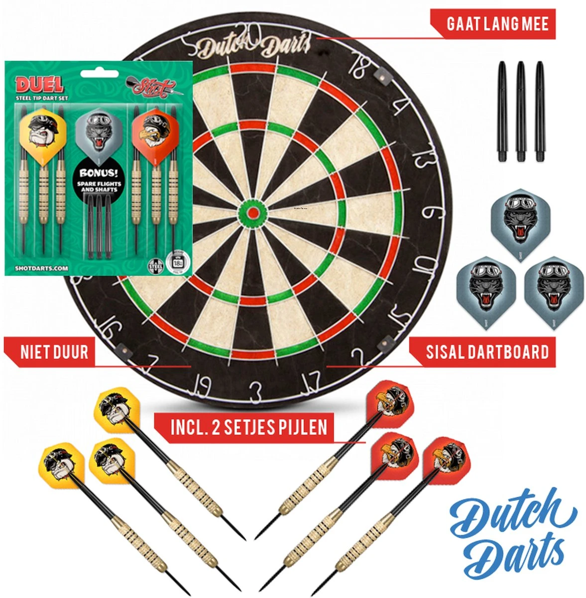 In de verpakking vind je 1 Dutch Darts Round Wire dartbord en 1 Shot Darts duel dartset. Dit Dutch Darts dartbord wordt geleverd inclusief bevestigingssysteem.