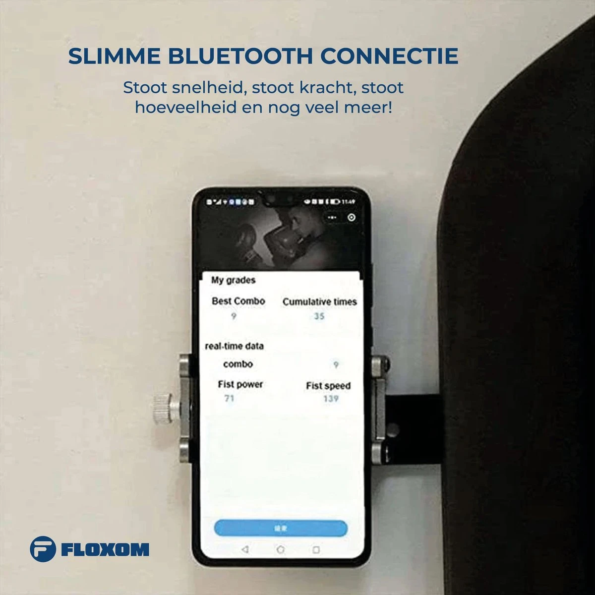 De Boxing Machine ondersteunt een slimme Bluetooth telefoonverbinding, zodat u op elk moment gegevens, slagsnelheid, slagkracht, aantal combinaties en andere gegevens kunt bekijken. De telefoon-houder is geschikt voor alle telefoons op de markt.