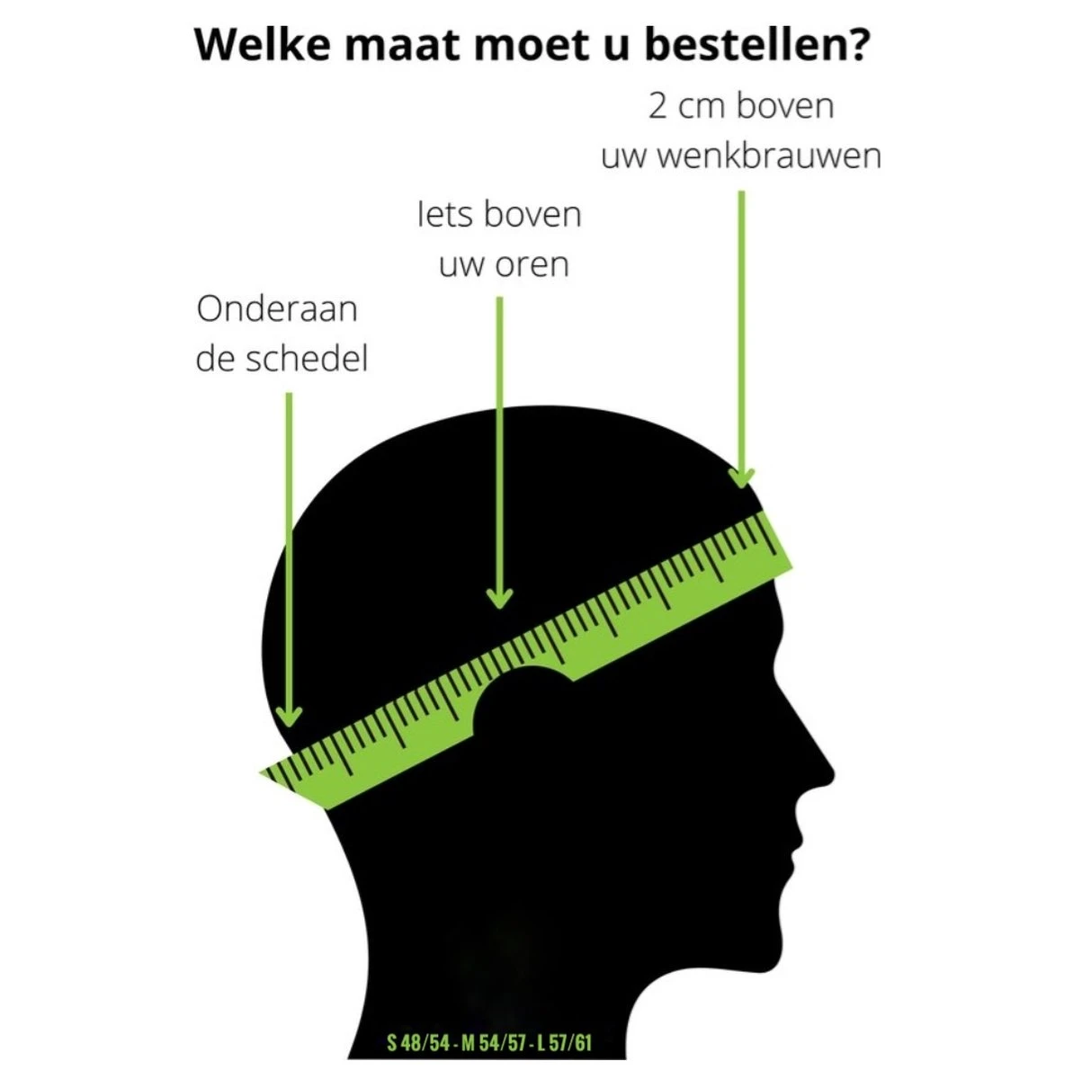 Zie foto’s voor het opmeten van je hoofd voor de juiste maat helm.