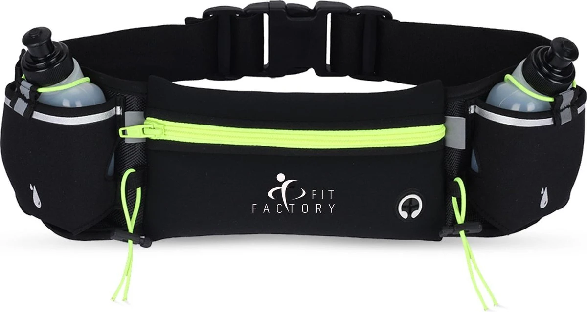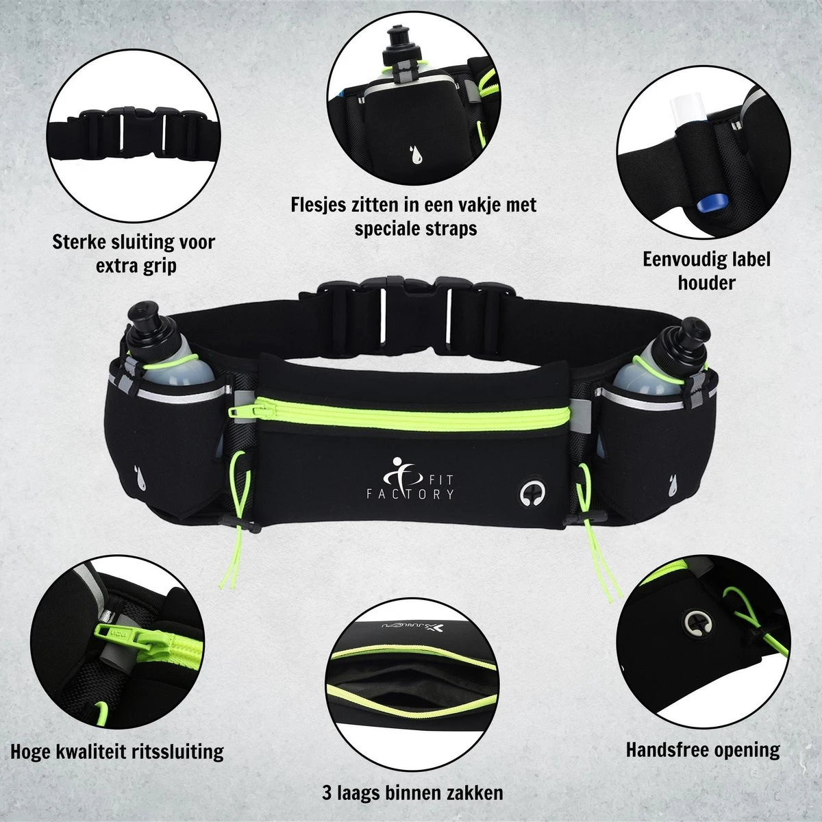 De Fit Factory hardloop heupband is voorzien van twee waterflessen, zodat je goed gehydrateerd blijft tijdens het hardlopen of wandelen. De handige elastiekjes plaats je om de flessen zodat ze op hun plek blijven zitten tijdens het hardlopen.
