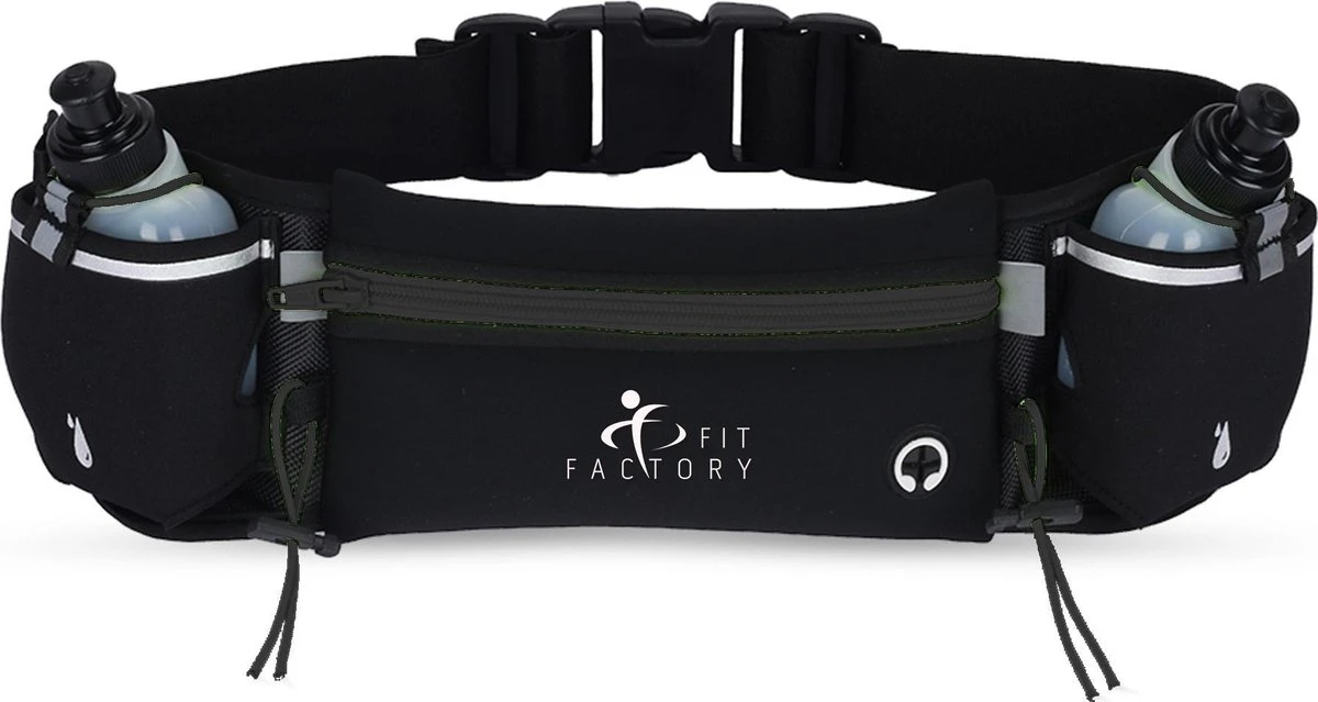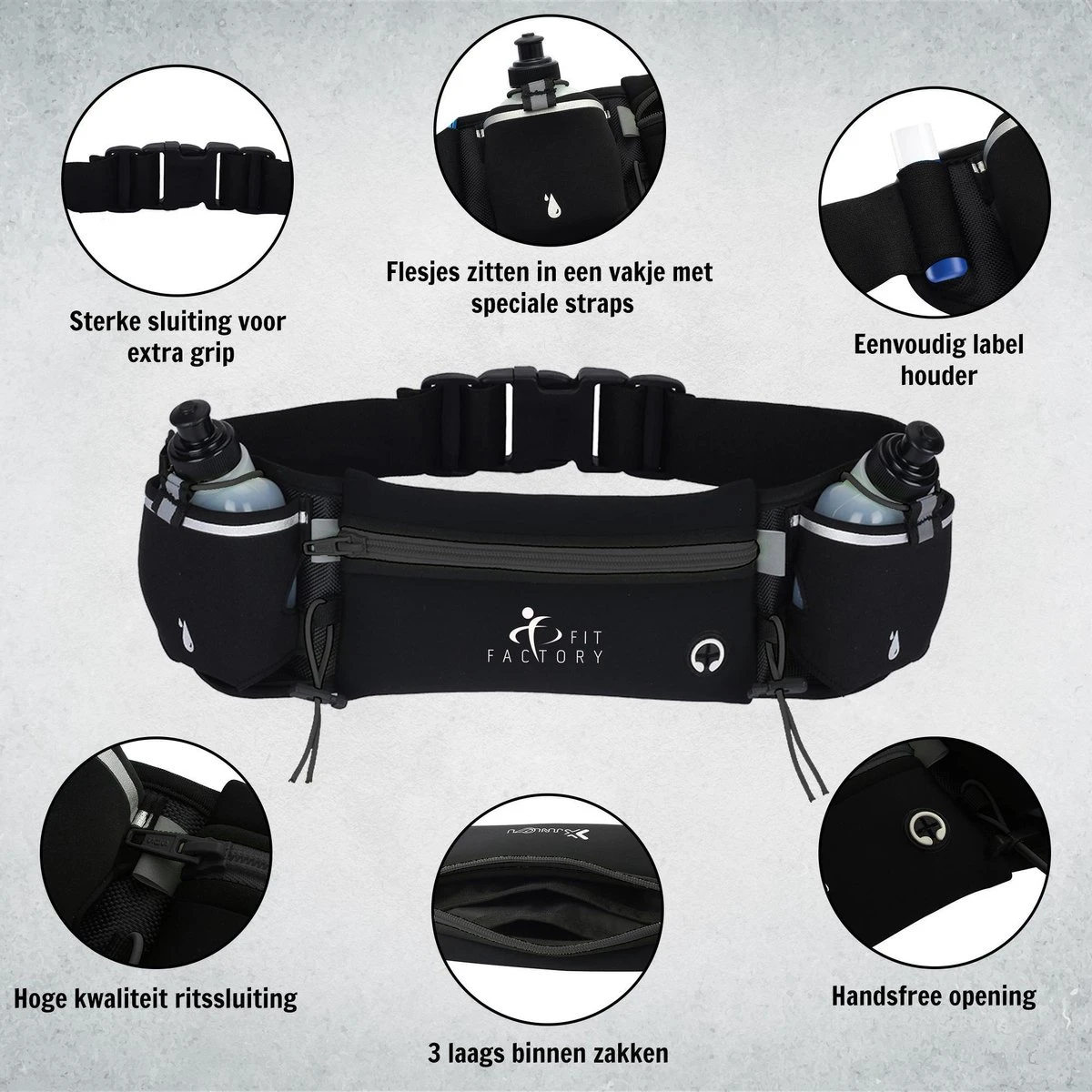 De Fit Factory hardloop heupband is voorzien van twee waterflessen, zodat je goed gehydrateerd blijft tijdens het hardlopen of wandelen. De handige elastiekjes plaats je om de flessen zodat ze op hun plek blijven zitten tijdens het hardlopen.