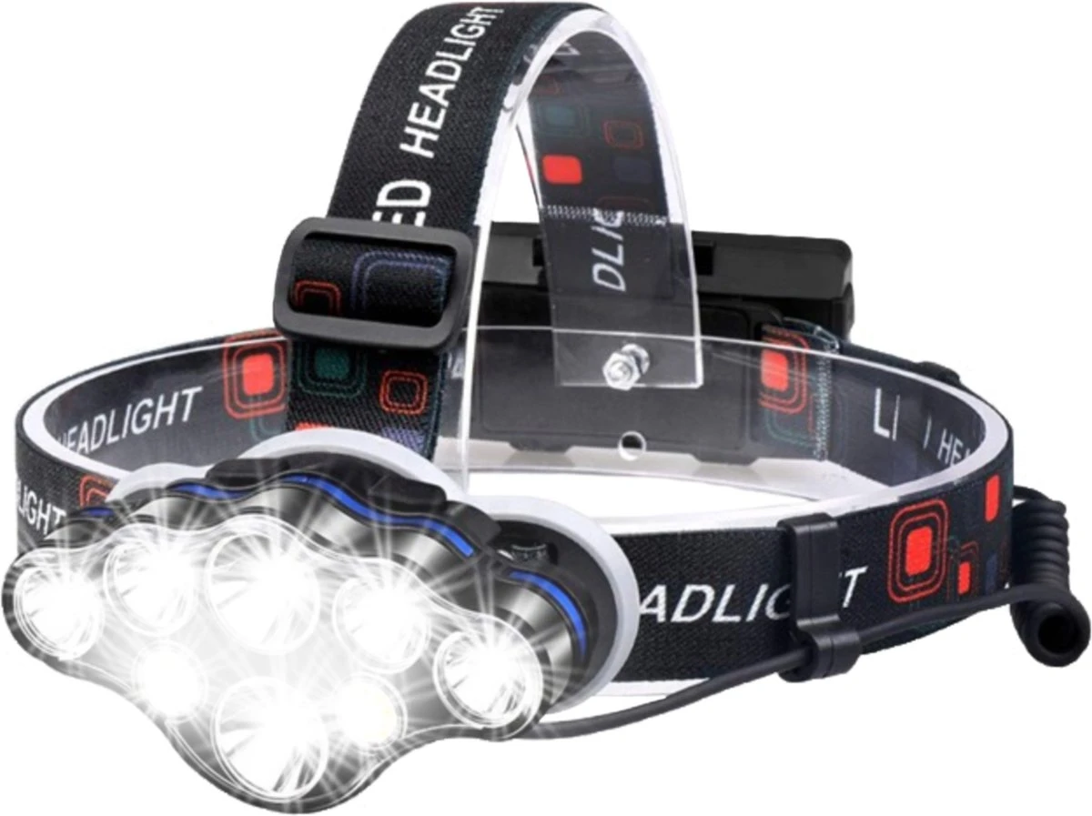 Uitgerust met twee oplaadbare batterijen, 8 LED koplampen met 18000 lumen vermogen en een bereik tot wel 500 meter, kun je van één ding op aan: met deze professionele hoofdlamp ga je goed uitgerust op avontuur. Terwijl de verstelbare hoofdband je van optimale kwaliteit voorziet, zorgen de 8 LED-koplampen voor duidelijk zicht, zodat jij in het donker nooit voor verrassingen komt te staan.