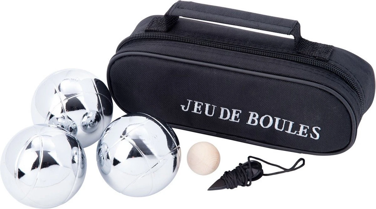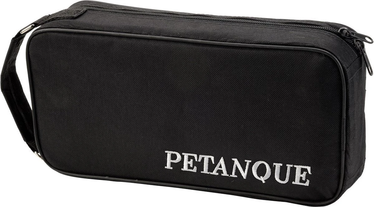Jeu De Boules set met drie ballen in een stevige zwarte tas met ritssluiting. De ballen wegen 720 gram per stuk en hebben een doorsnede van 74 mm. Het handige tasje bevat ook nog een but, een meetlint en voor de onervaren gooier: de spelregels! Let op: Deze set wordt willekeurig geleverd met 0, 1, 2 en 3 strepen.