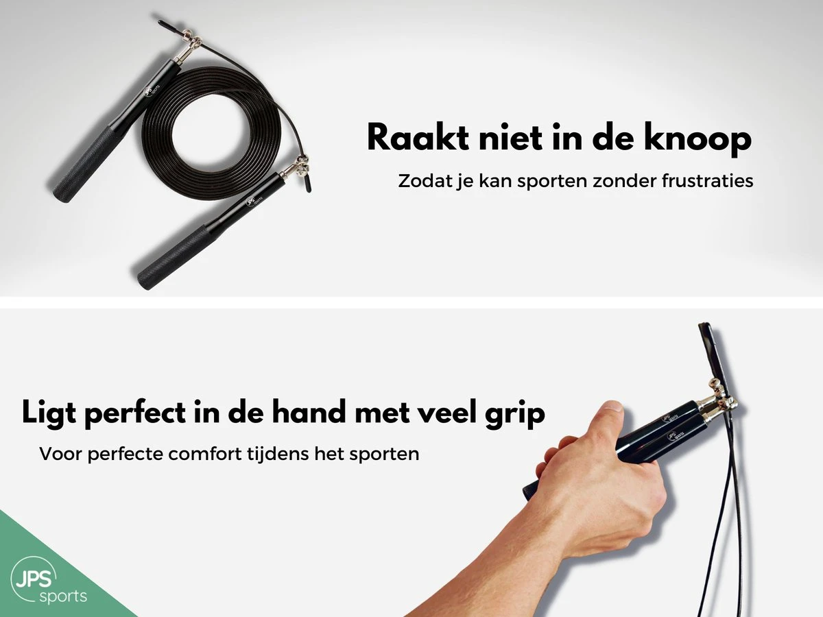 Door het kogellager systeem in de hendels kan je de JPS Sports® speed rope gebruiken om topsnelheid in jouw cardio workout te behalen! Door het lichte materiaal en de goede grip ga je met dit springtouw keer op keer met een hogere snelheid kunnen springen!