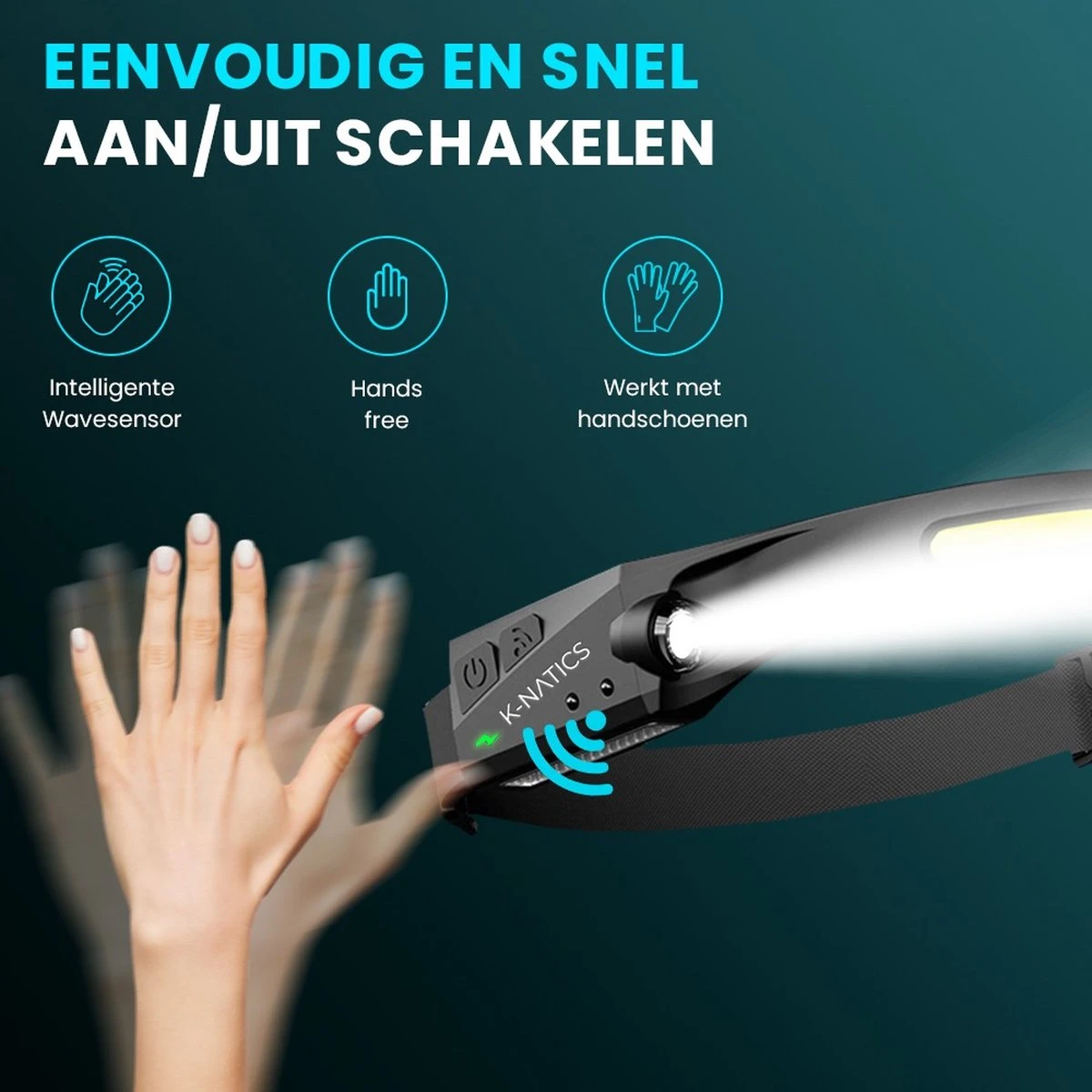 Met de K-NATICS ARC hoofdlamp werk je altijd effectief en handsfree in het donker. Deze hoofdlamp beschikt over 2 aparte lichtbronnen. Met de innovatieve COB-technologie schijn tot wel 50 meter ver in een hoek van 230 graden waardoor het lijkt alsof het daglicht is. En met de XPE side beam krijg je een gebundelde spot die in zijn felste stand een lichtopbrengst van 500 lumen heeft. Meer dan genoeg licht voor hobbywerkzaamheden, tijdens het klussen, hardlopen, kamperen of bij het uitlaten van de hond. Dankzij de innovatieve bewegingssensor zet je de hoofdlamp eenvoudig aan/uit door met je hand voor de bewegingssensor te zwaaien.