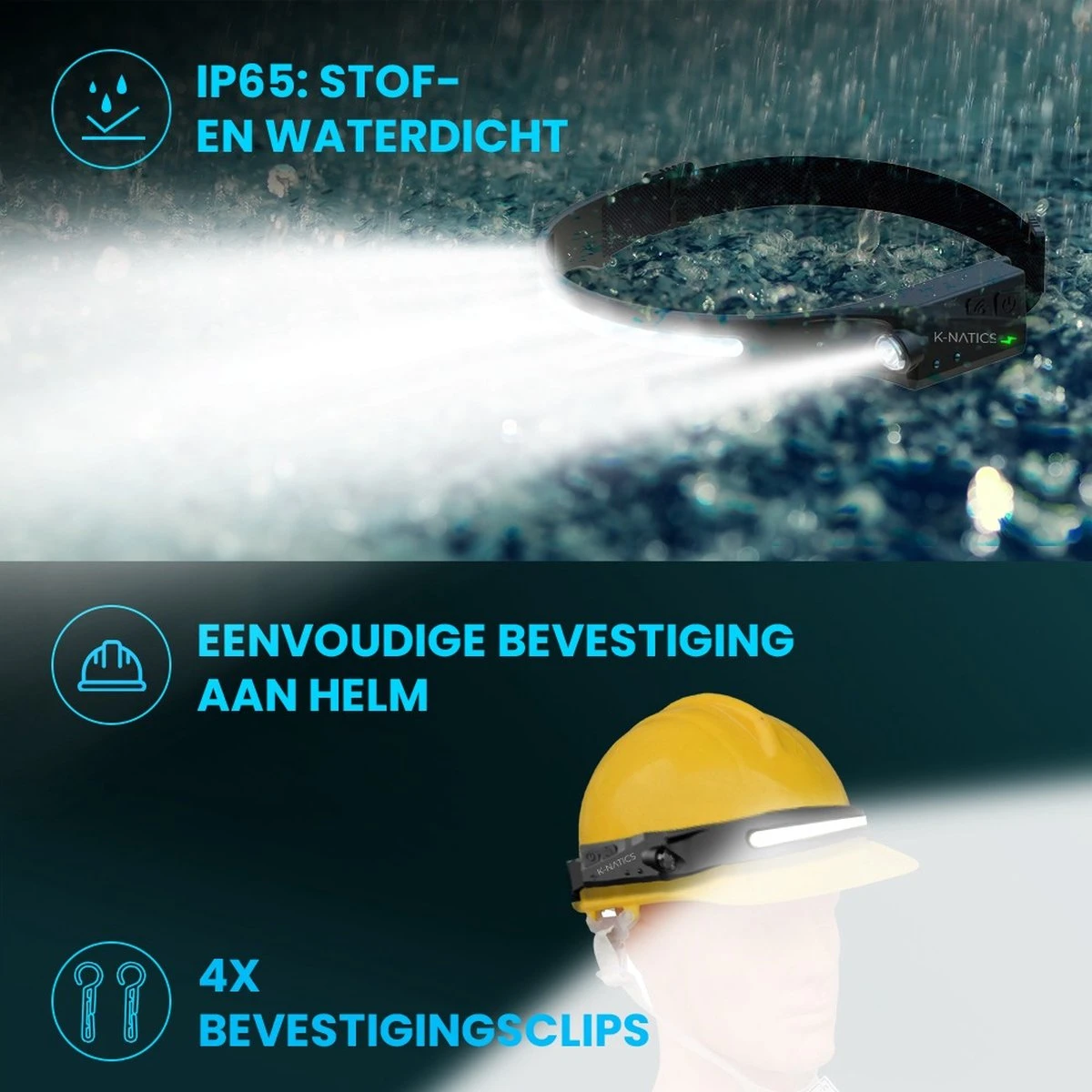De K-NATICS ARC is gemaakt van flexibel duurzaam siliconen waardoor deze licht en compact is. Hierdoor zal je bij langdurig gebruik geen last van je hoofd of nek krijgen. In de meegeleverde K-NATICS case neem je hem gemakkelijk overal mee naartoe. Werk je veel op de bouwplaats? Of gebruik je de lamp bij outdoor activiteiten? Wij leveren 4 speciale clips mee, zodat je de lamp stevig vast kunt maken aan je helm, handig toch?