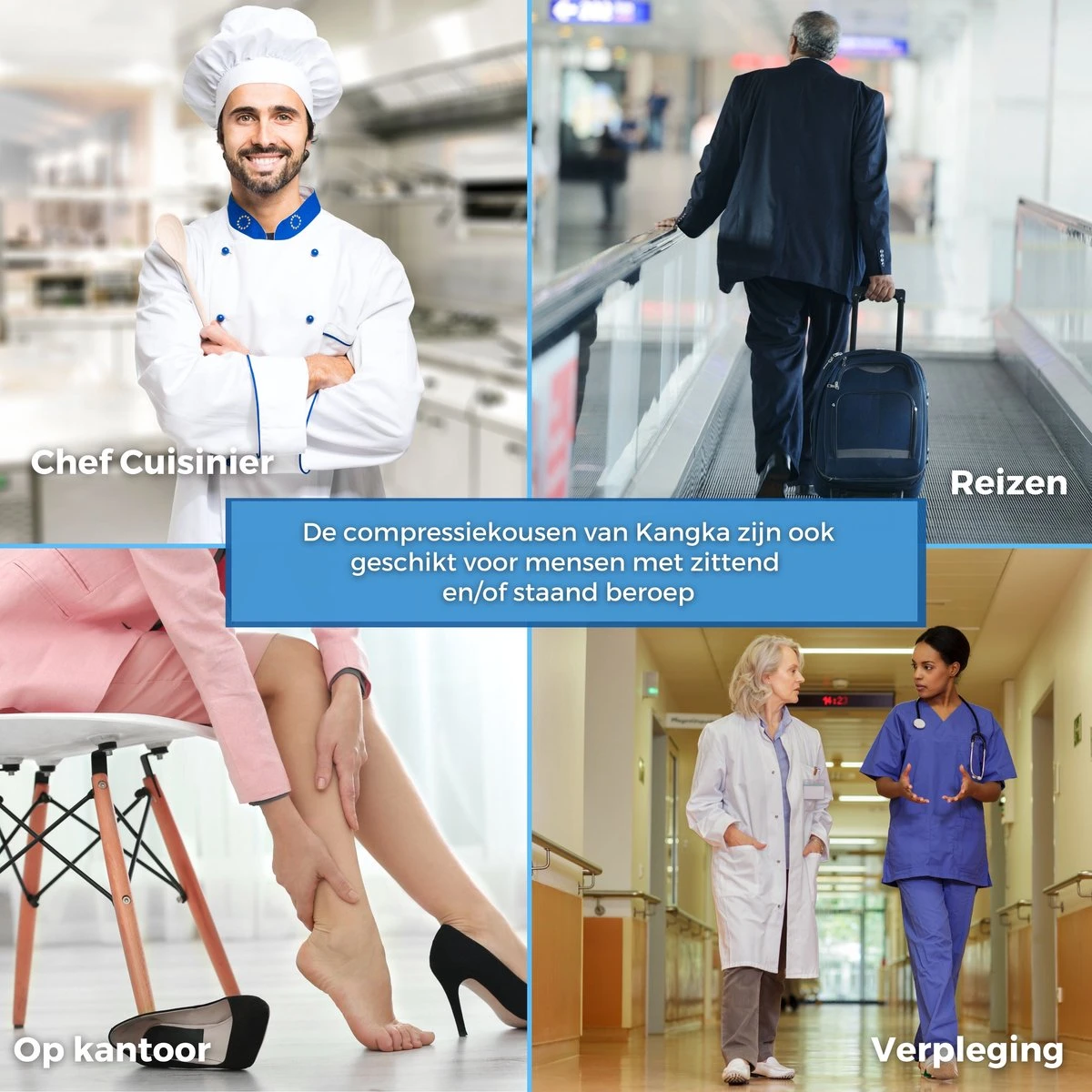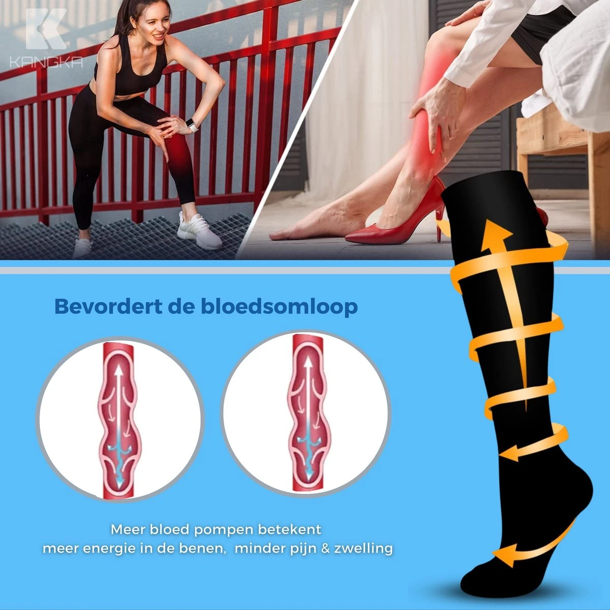 Last van pijnlijke benen, spataderen, zwellingen, krampen of vermoeide benen? Ben je op zoek naar compressiekousen die je kunnen helpen met het verlichten van deze klachten? Dan zijn de Compressiekousen van Kangka de beste keuze. Onze compressiekousen zijn geschikt voor het hardlopen, wandelen, reizen, op het werk (zittend of staand beroep), en sporten.