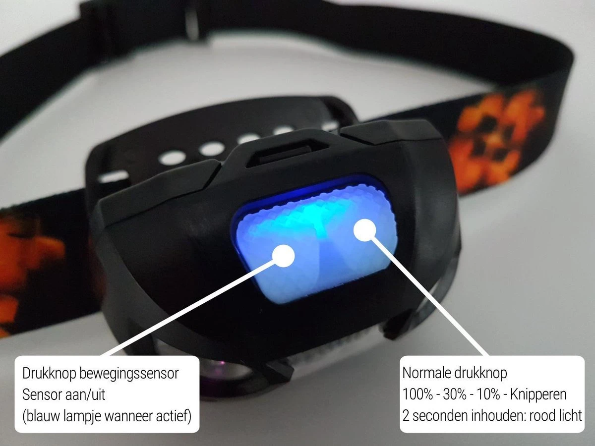 Deze LED hoofdlamp heeft naast de normale aan/uit knop maar ook een handige bewegingssensor. In deze stand kun je de lamp aan en uit zetten door je hand ervoor te bewegen.