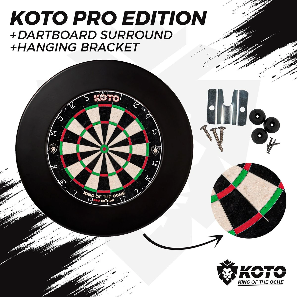 Eenvoudige installatie: Het KOTO Pro Edition Dartbord wordt geleverd met professionele bracket en gebruiksaanwijzing zodat je het dartbord op de juiste hoogte kunt hangen. De Surround klem je om het dartbord heen, hier heb je verder geen bevestigingsmaterialen voor nodig.