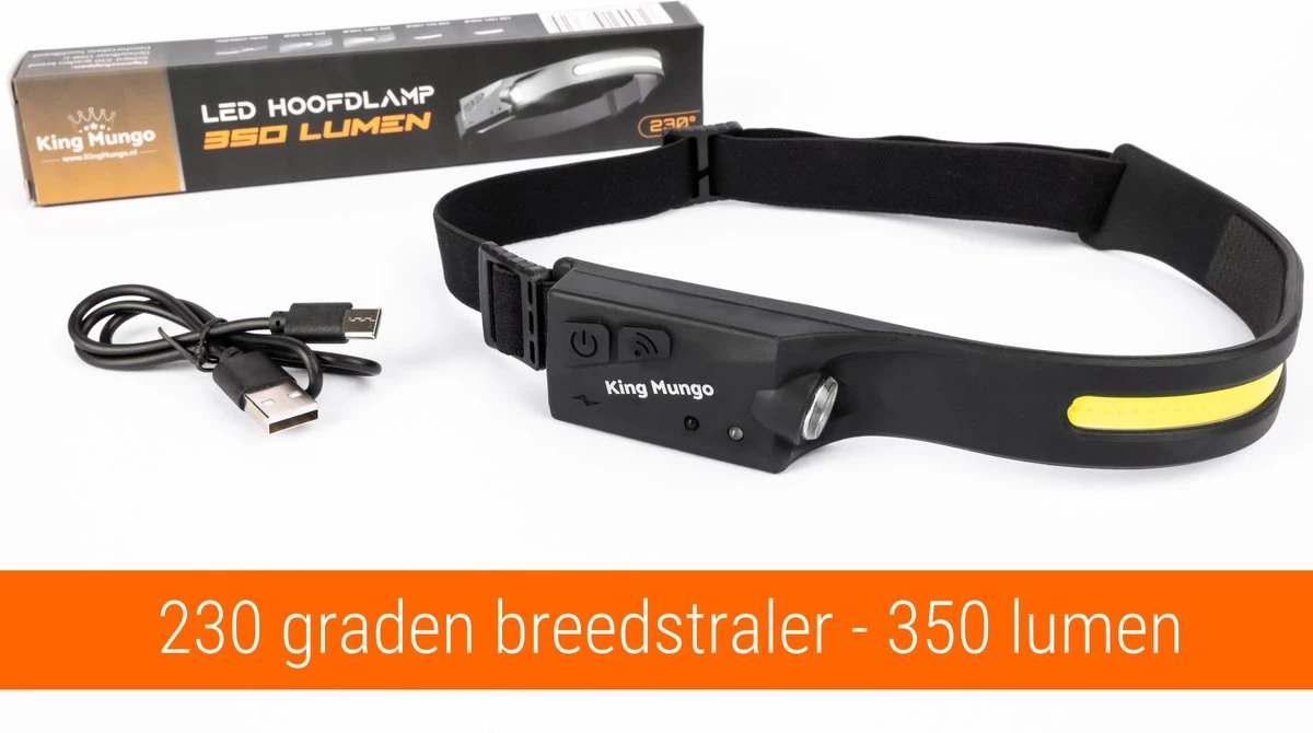 LED Hoofdlamp met oplaadbaar accu en volledig zicht met een breedstraler die 230° schijnt. Met handige bewegingssensor. Deze nieuwste hoofdlamp led is oplaadbaar met USB-C aansluiting. Zéér felle LED met verschillende lichtstanden, led verlichting van wel 350 lumen, waterafstotend IPX4. Zeer geschikt als hardlooplamp (hoofdlamp hardlopen), klus- en werklamp, maar ook tijdens de reparatie van een auto, als vislamp, campinglamp, dierenarts of hoofdlamp om de hond mee uit te laten. Met verstelbare en comfortabele hoofdband.