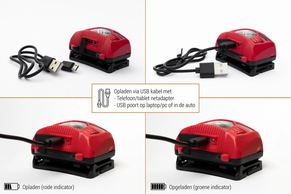 In de led-hoofdlamp zit een oplaadbare batterij, die gemakkelijk op te laden is met de bijgeleverde USB kabel. Je kunt hem opladen met je laptop (usb poort) of telefoon adapter (power adapter niet meegeleverd). Doordat de hoofdlamp led oplaadbaar is hoef je niet steeds nieuwe batterijen te kopen (goed voor het milieu en voor je portemonnee). De oplaadbare batterij is lichtgewicht dus heel fijn in dit usb hoofdlampje.