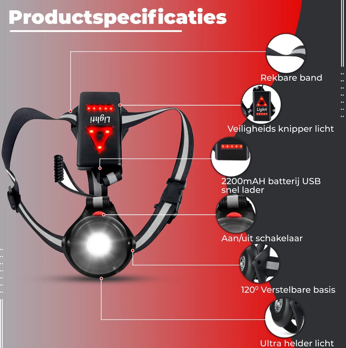 Voor je eigen veiligheid en die van andere weggebruikers is het een goede keuze om de Lighti hardloopverlichting aan te schaffen. Ook in de donkere periode wil je graag sporten. Het Lighti hardloopvest met LED verlichting zorgt voor een verlichte omgeving tot wel 50 meter ver. Hierdoor zie je snel wat voor obstakels er op de weg liggen en kun je blessures vermijden. Op de achterkant van het hardloopvest zit een rood verlicht driehoek die dient om andere weggebruikers te waarschuwen dat jij aan het sporten of wandelen bent. Het vernieuwde model van de hardloop verlichting beschikt over reflecterende strepen op de elastische band, wanneer een fiets of auto met zijn verlichting daar overheen schijnt ben je nog zichtbaarder voor hen.