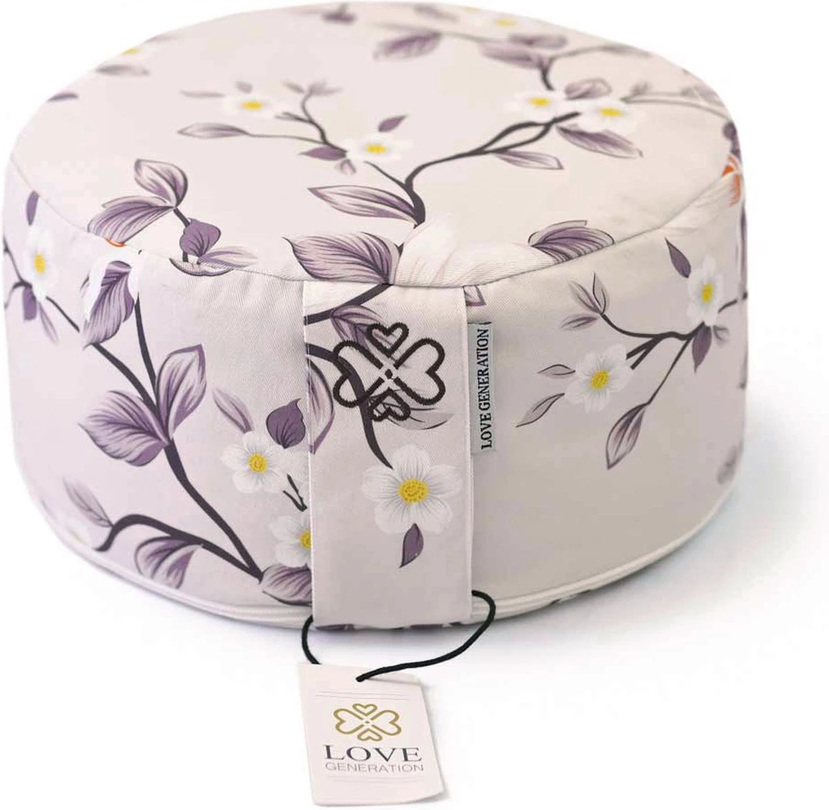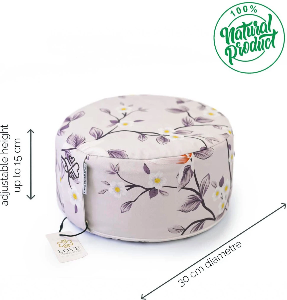 Dit Love Generation ronde meditatiekussen, ofwel ‘zen zafu’ is gemaakt van een zeer stevige katoenen canvas, en is gevuld met biologische boekweit doppen.