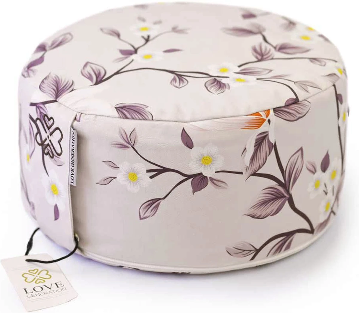 Wat dit Love Generation meditatiekussen uniek maakt is niet alleen de onverslijtbare hoes en de extra brede draagband, maar vooral de rits waarmee je de buitenhoes van het binnenkussen kunt afnemen; in tegenstelling tot bijna alle andere meditatiekussens hebben de kussens van Love Generation een stevige rits helemaal rondom de onderkant, in een cirkel. Hierdoor kun je de hoes helemaal openen alsof het een deksel is, en zo het binnenkussen écht gemakkelijk uitnemen. En dat scheelt een heleboel geduw en geprop als je het buitenhoesje wilt uitwassen. Het lipje van de rits zit uiteraard netjes en veilig verstopt achter de draagband.