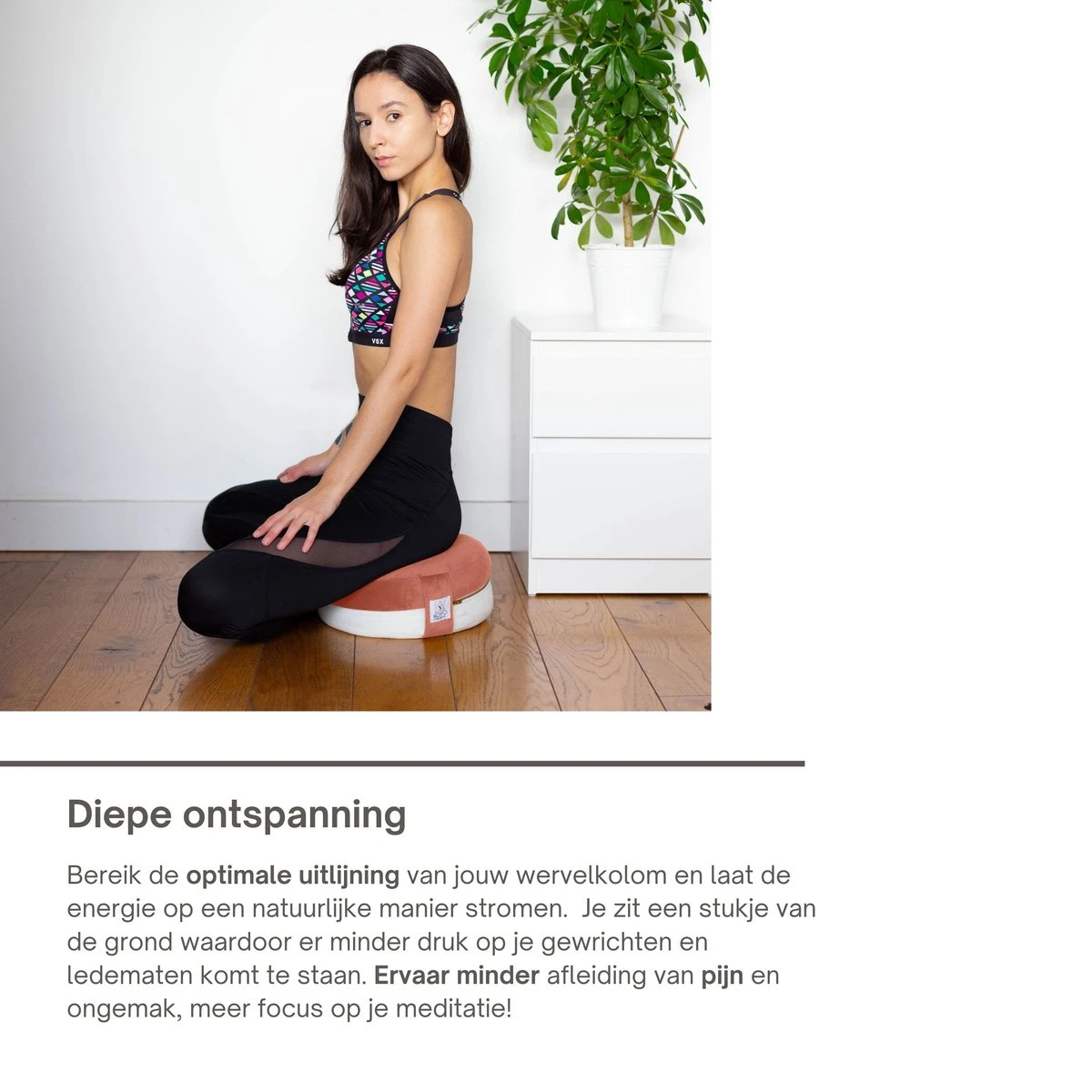 - Diepe ontspanning: Bereik de optimale uitlijning van jouw wervelkolom en laat de energie op een natuurlijke manier stromen. Je zit een stukje van de grond waardoor er minder druk op je gewrichten en ledematen komt te staan. Ervaar minder afleiding van pijn en ongemak, alleen zo kom jij tot diepe ontspanning tijdens jouw meditatiesessie.