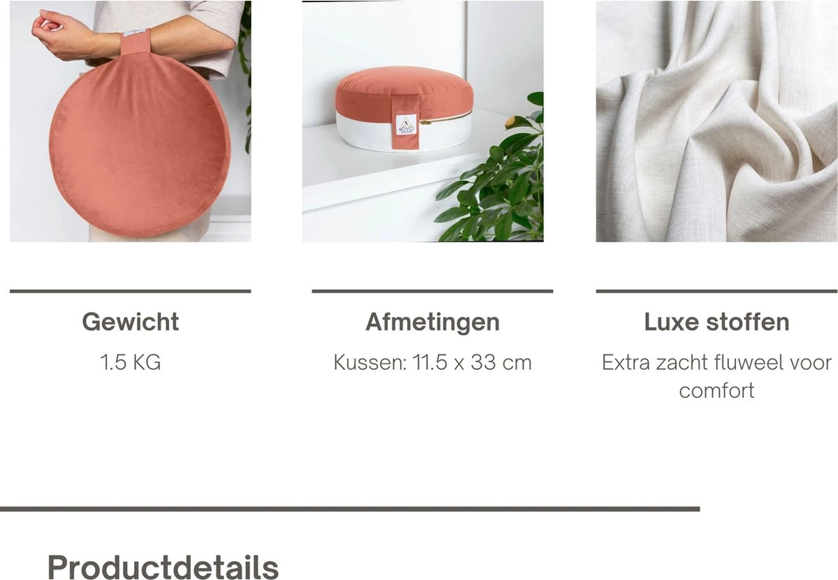 - Gebruik in verschillende poses: Het kussen is geschikt voor de kleermakers zit of de Japanse zithouding waarbij op je knieën zit met je voeten plat naar achter. Het kussen is uitermate geschikt om te gebruiken tijdens yoga poses voor extra stimulatie en ontspanning.