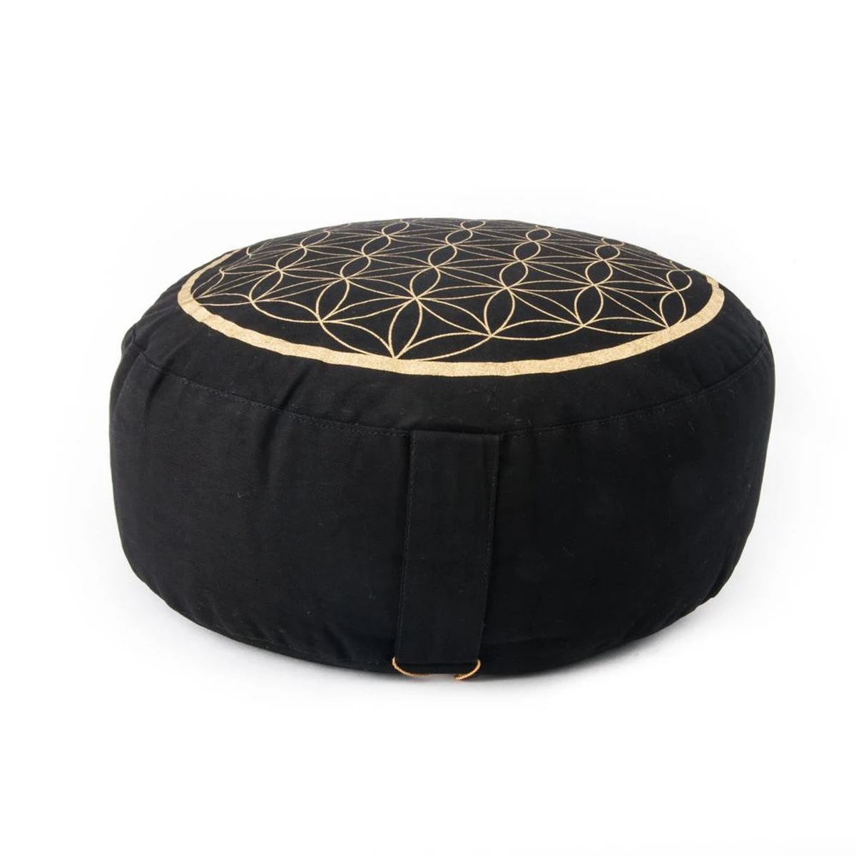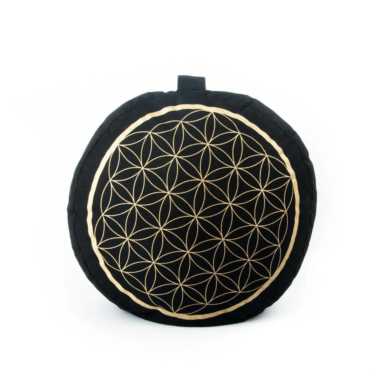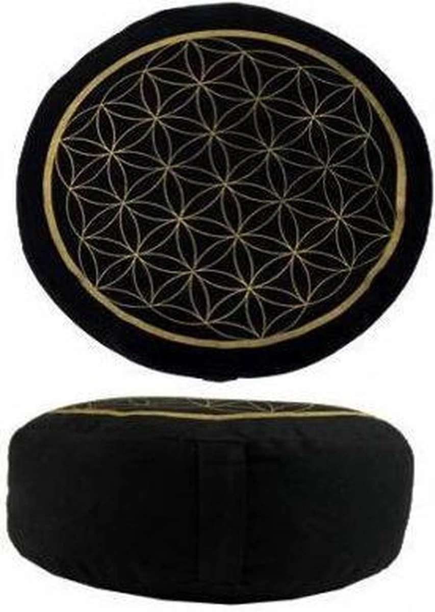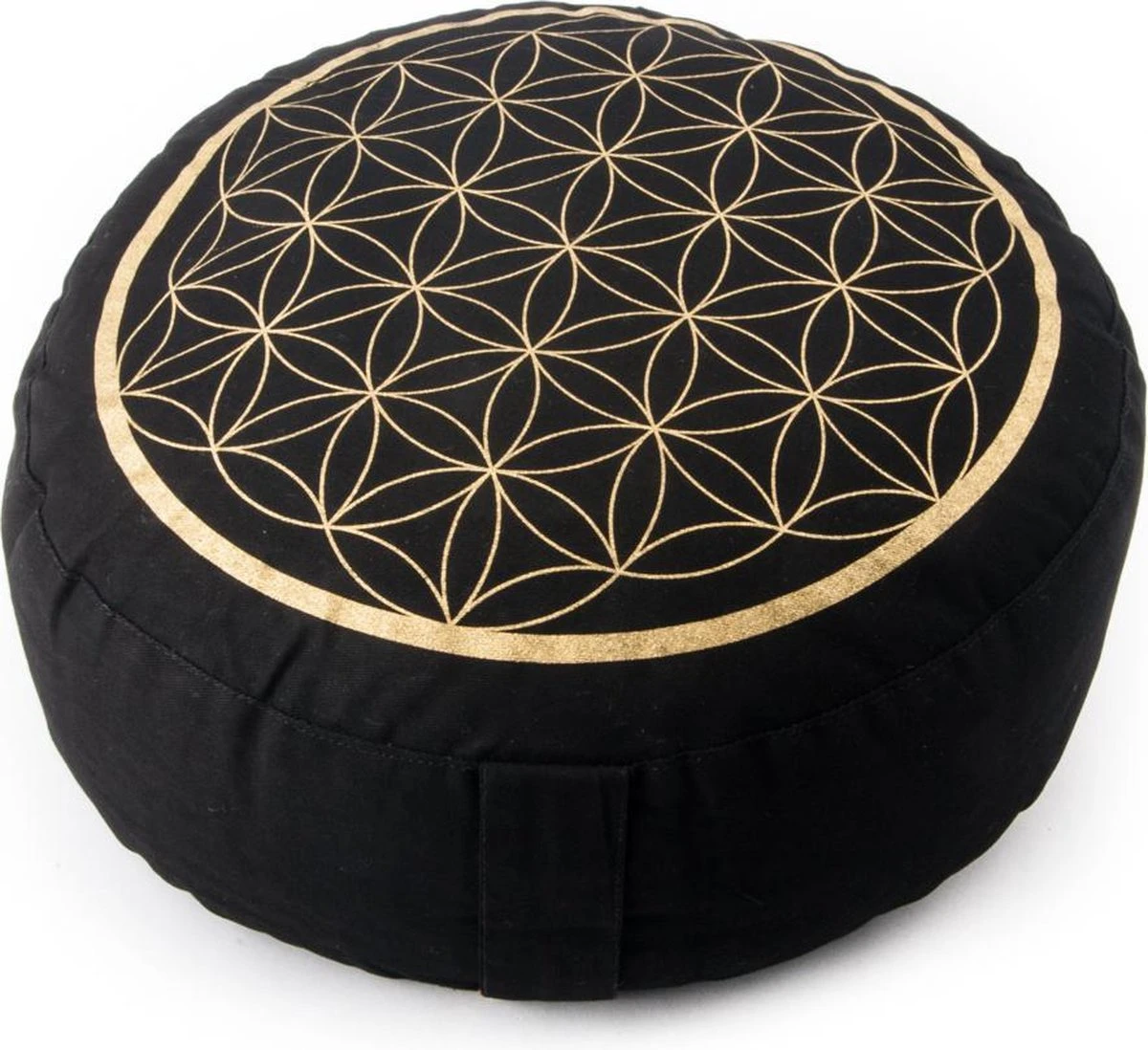 Meditatiekussen Zwart/goud Levensbloem Opdruk – Katoen – Boekweit – 33×17 – Zwart – Goud