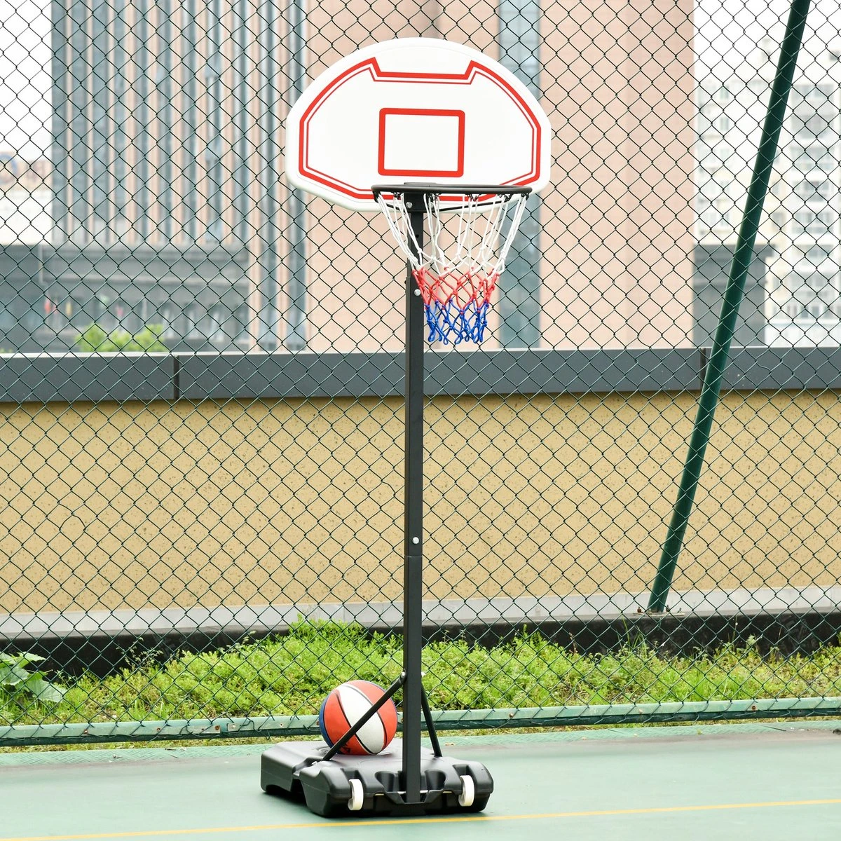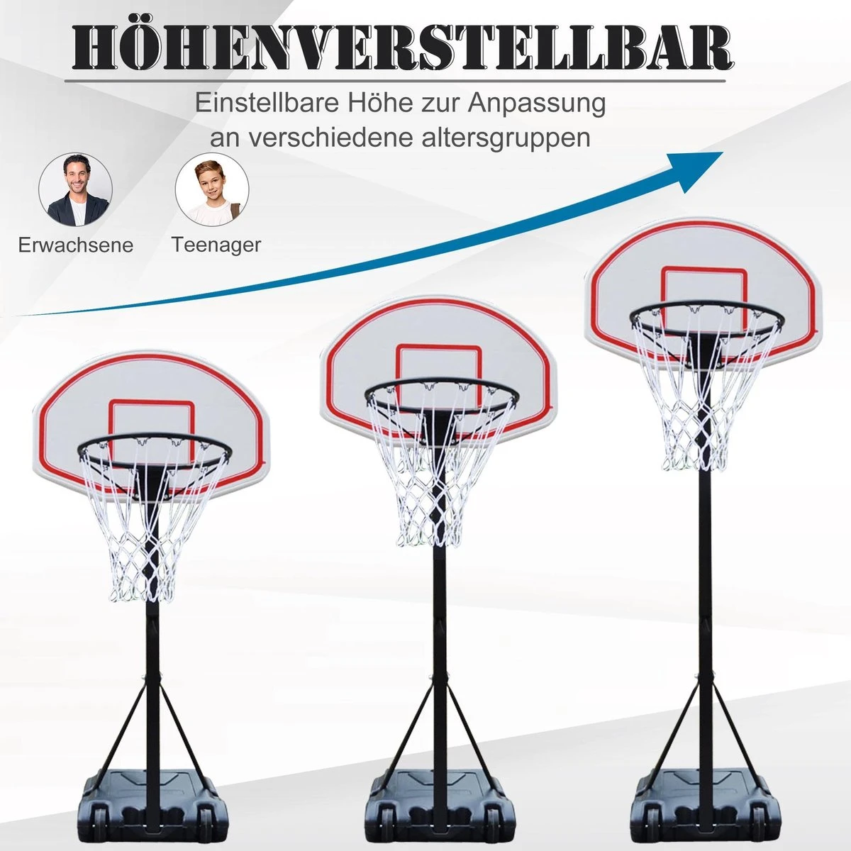 Kinder-Basketballstandaard voor huis en tuin. De standaard is in hoogte verstelbaar en “groeit” met je kind mee. Je kind kan lang plezier hebben met deze tak van sport. De stabiele voet wordt leeg aangeleverd en kan naar believen worden gevuld met bv. water of zand.