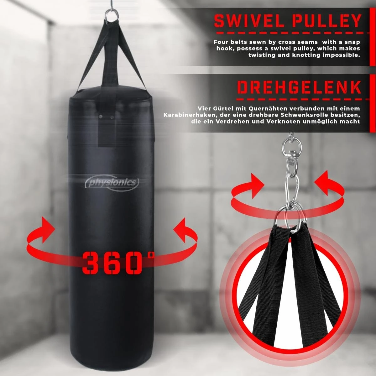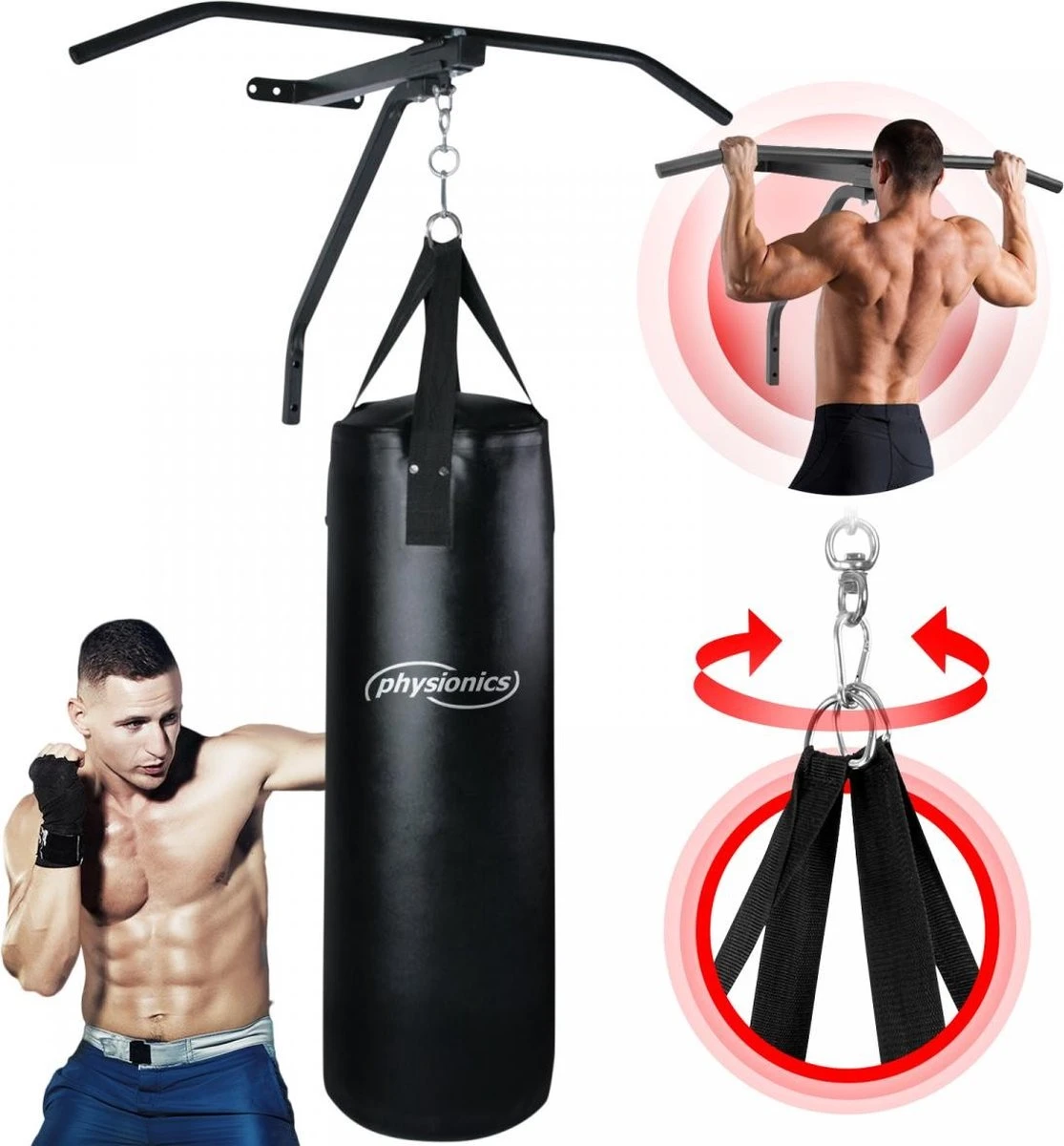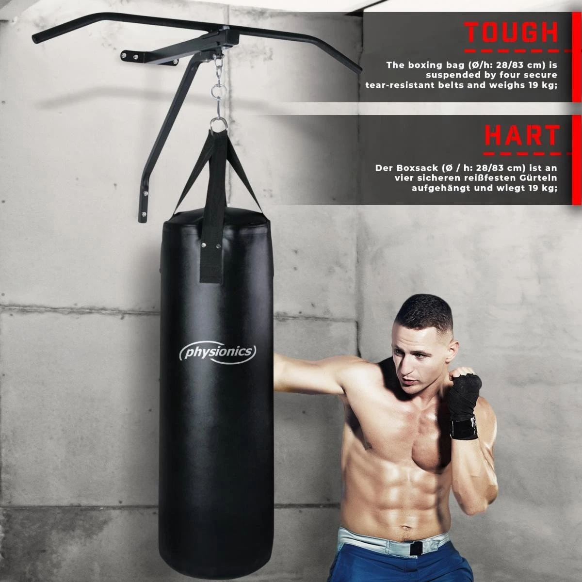 brengen u in vorm met onze kwalitatieve trekstang inclusief bokszak – > stabiele staalbuisconstructie – > stabiele scheurbestendige en afneembare bokszak van kunstleer gevuld met zijn hoogwaardige grondstof – > 4 stabiele scheurvaste gewebegurtbänder genaaid per kruisnaad – > geschikt voor beginners en gevorderden – > Eenvoudige montage en op/verminderen Technische gegevens trekstang: – > afmetingen trekstang (B x H): ca. 83 cm x 50 cm – > afmetingen bokszak (BxDxH): ca. 83 x 28 x 28 cm – > gewicht bokszak: ca. 19 kg – > totale hoogte: ca. 133 cm – > totaalgewicht trekstang + bokszak: ca. 225 kg – > materiaal: staal en kunstleer – > kleur: zwart – > Textile textielgrondstofsamenstelling: 100% polyurethaan Inhoud trekstang: 1 x trekstang met bokszak (als bouwset voor zelfmontage) 1 x verkrijgbaar montagehandleiding (de/FR/en). Opmerking: er is geen schroeven/pluggen voor wandmontage bij.