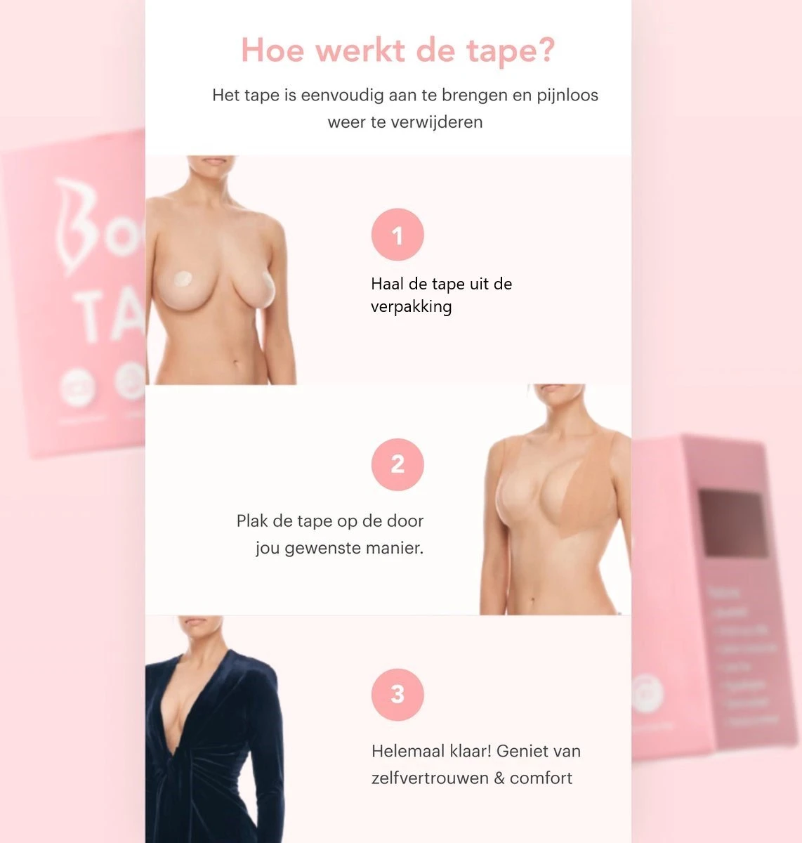 De Boob Tape is erg makkelijk in gebruik. De eerste keer zul je wel een beetje moeten oefenen. Maar wees niet bang, je krijgt er snel handigheid in en zult dan niet meer anders willen! Hiernaast ben je binnen een mum van tijd klaar met het aanbrengen van de Boob Tape en kan je snel beginnen met je dag.