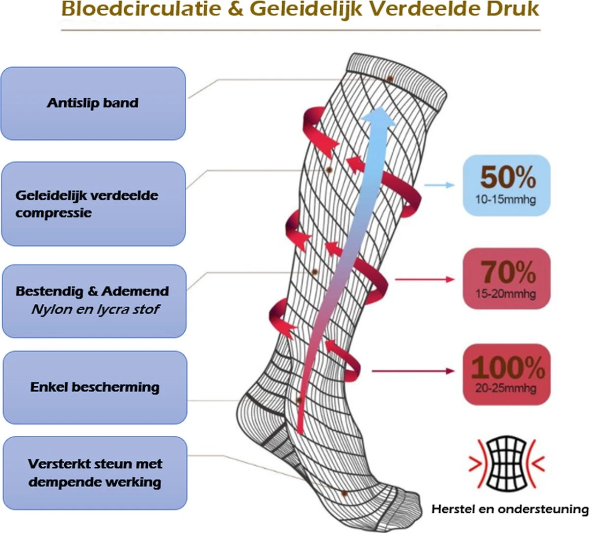 Compressie sokken of compressiekousen zijn onmisbaar bij het sporten. Door de vele voordelen zijn de compressie sokken ideaal voor: wandelen, hardlopen, crossfitten, wielrennen en nog veel meer! De sokken zijn ontworpen met een speciale compressietechniek. De sokken geven een lichte druk bij de enkel (20-25 mmHg), deze druk neemt naar de kuit toe geleidelijk af (10-15 mmHg)
