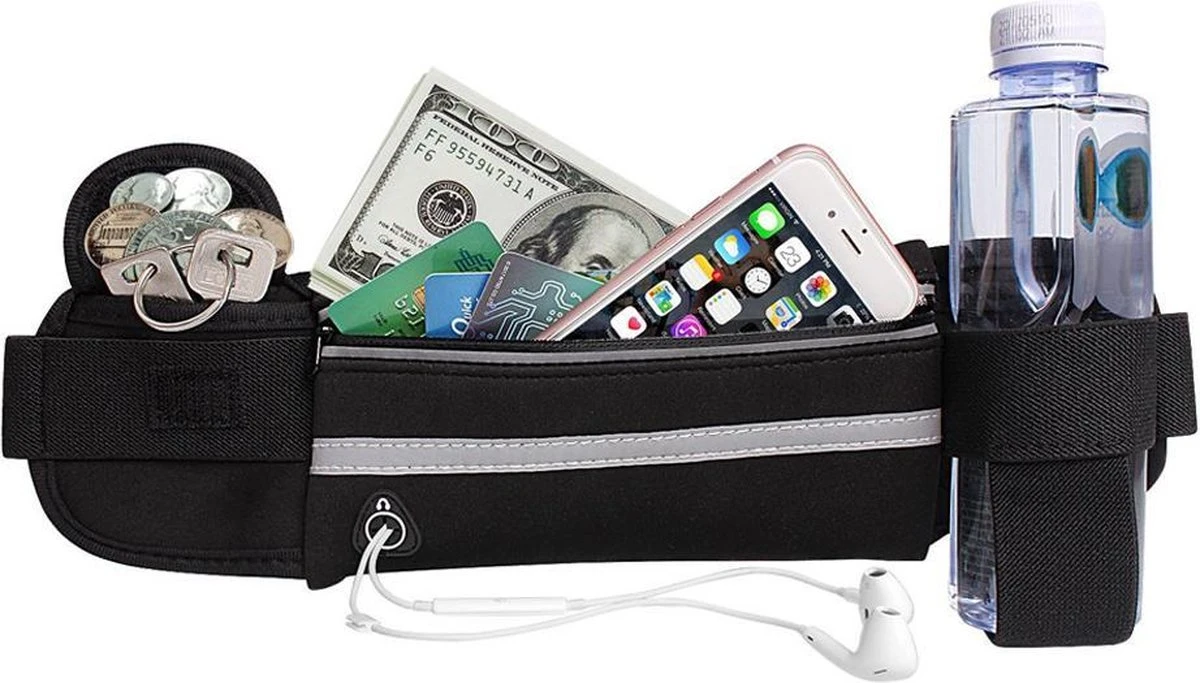 Het ruime opberg vak is voorzien van een rits en biedt voldoende ruimte om deze spullen (vooral je mobiele telefoon) veilig en goed op te bergen. Door de speciale uitgang in het buideltasje kan je het snoertje van je koptelefoon/oortjes gewoon aansluiten waardoor je tijdens het hardlopen of andere sport kan blijven luisteren naar muziek, een podcast of naar een hardloopprogramma/ hardloop app.