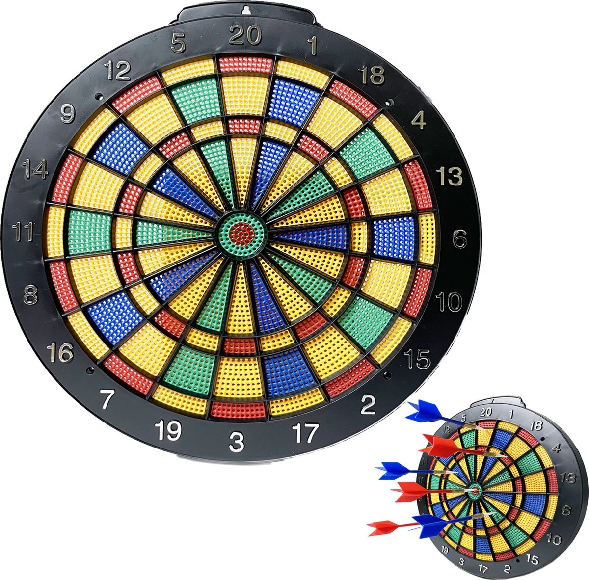 Dartbord, inclusief 6 pijlen in 2 verschillende kleuren en ophanghaak.
