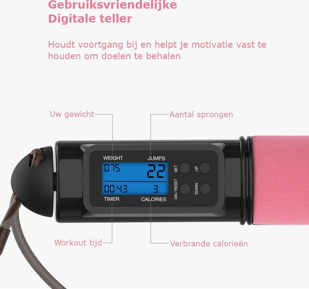 LCD-scherm (gewicht, aantal sprongen, calorieën, tijd)