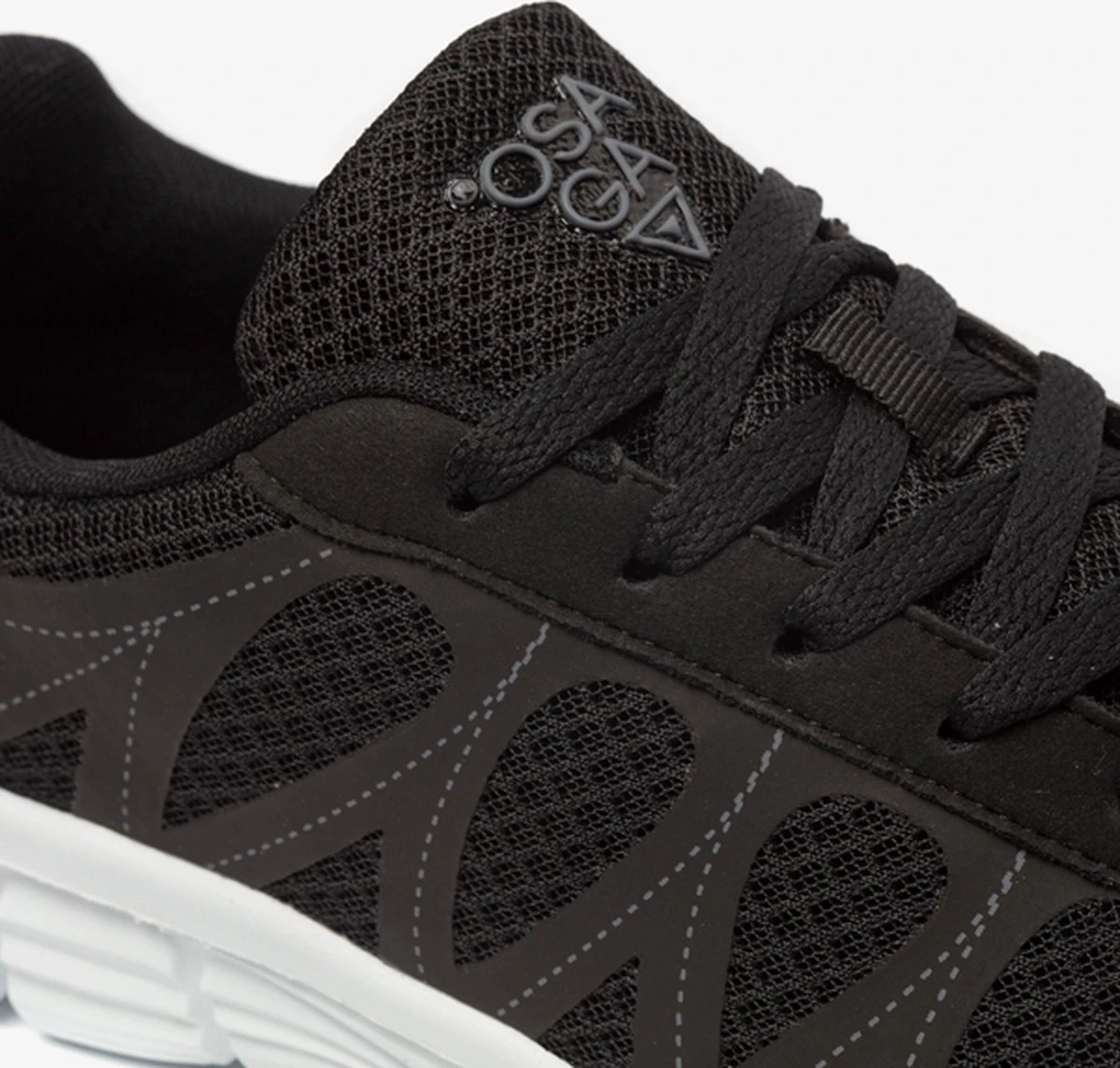 Zwarte hardloopschoenen voor heren van Osaga. Gemaakt van textiel, een binnenwerk van textiel en een stevige profielzool. De sneakers hebben een vetersluiting en aantreklusje op de hak voor een makkelijke instap. Het comfortabele voetbed is gemaakt van textiel. Deze is niet uitneembaar. Het lichtgewicht bovenwerk is ademend en vormt zicht naar de voet. De flexibele buitenzool biedt grip en demping.