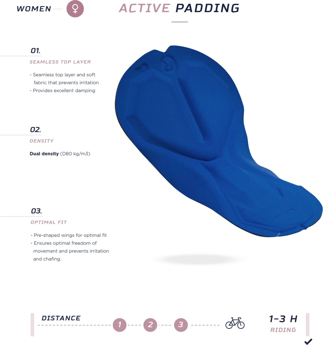 The Active chamois perfectly complements the design of the tights. This antibacterial 9 mm foam chamois with contoured wings and 3D Zero Friction Design is soft to the touch and prevents irritation and friction.