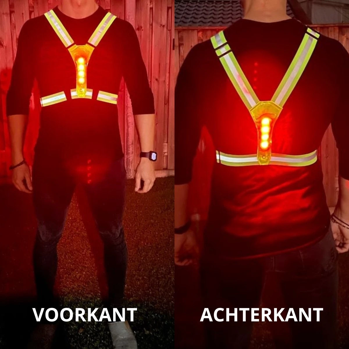 De krachtige LED verlichting verlicht je directe omgeving goed, hierdoor zien andere weggebruikers waar je loopt, zie je waar jezelf loopt en voorkom je blessures. Het X-vormige hardloopvest is aan de voorzijde voorzien van 4 rode LED lampen en aan de achterkant voorzien van 4 rode LED lampen. Verder is het X-vormige hardloopvest voorzien van reflecterende banen.