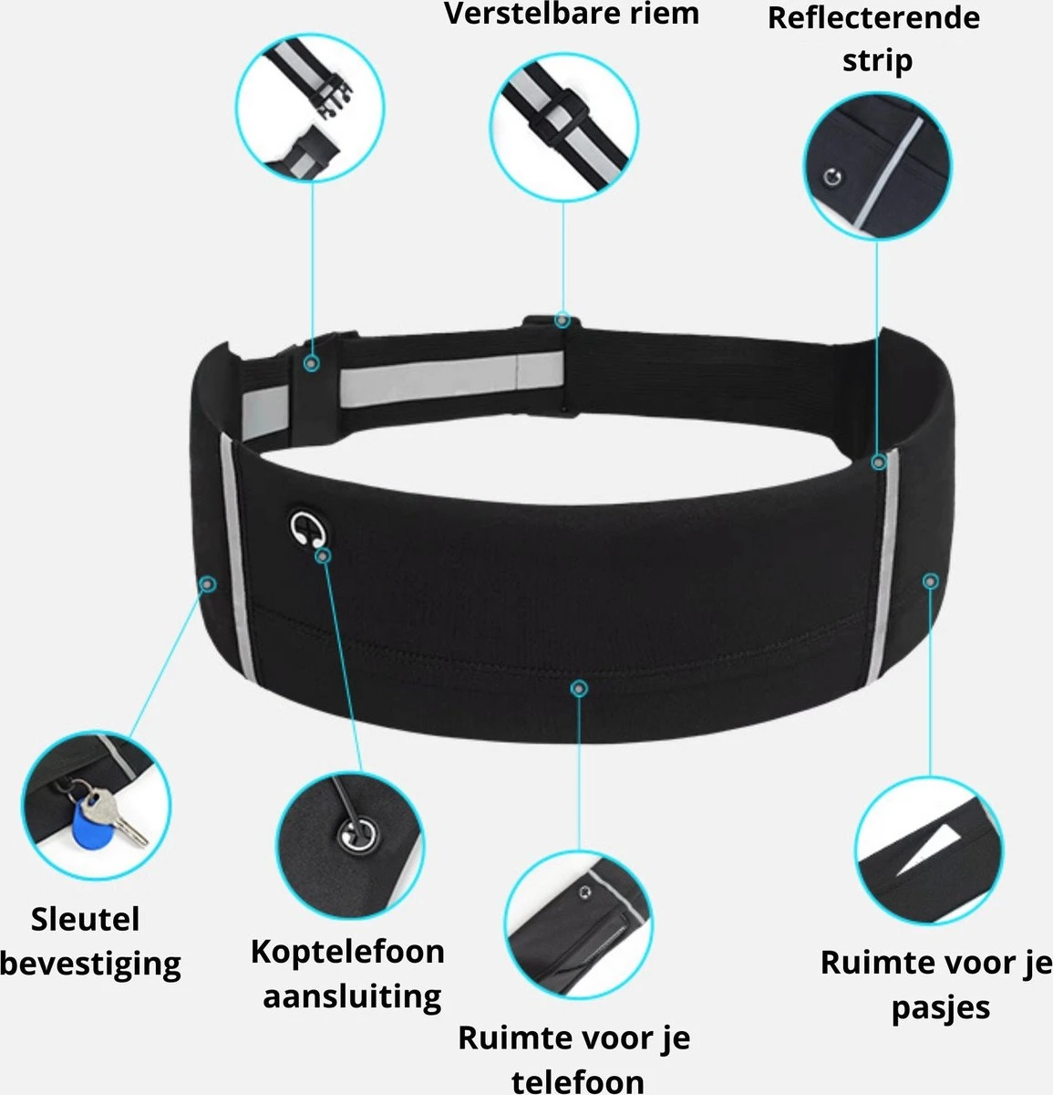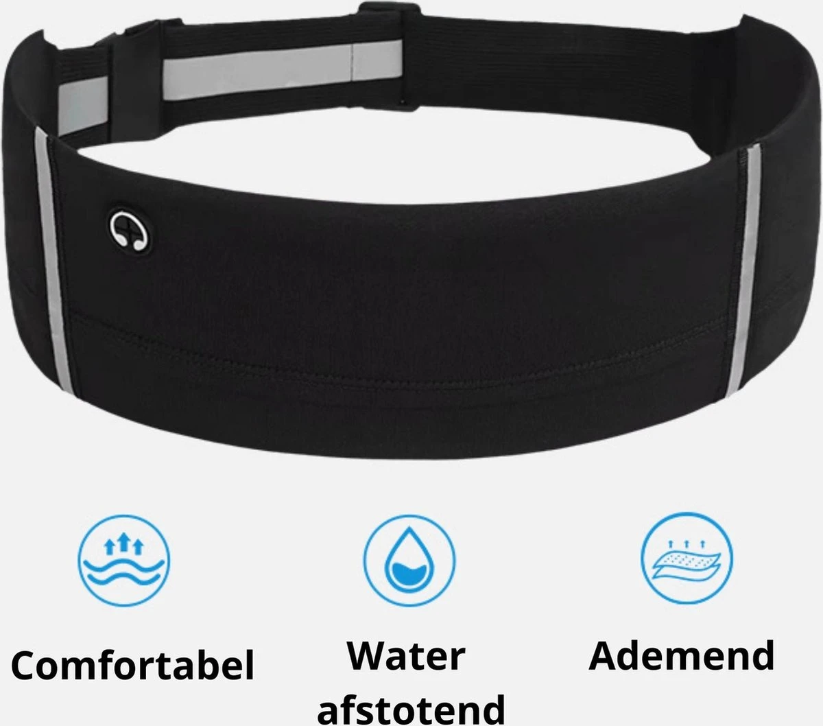 De hardloop heupband is voorzien van een verstelbare band waardoor je deze erg eenvoudig op je eigen afmetingen instelt. Dankzij de reflecterende lijnen op de heupband ben je extra goed zichtbaar voor tegemoetkomend verkeer.