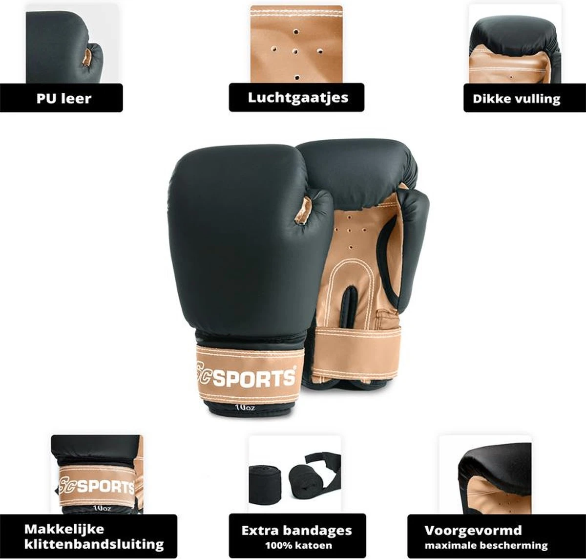 Inbegrepen zijn goed gevoerde bokshandschoenen in de maat 10 oz (zie productspecificaties bokshandschoenen). Boksbandages van katoen bieden extra bescherming voor de polsen.