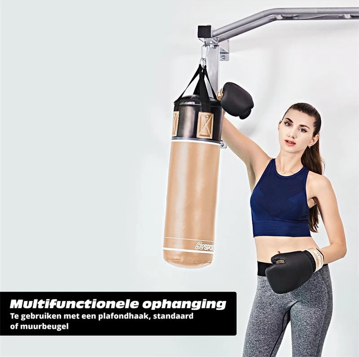 Boksset bestaande uit een bokszak met nylon ophangriemen, bokshandschoenen, boksbandages en bijpassende tas.