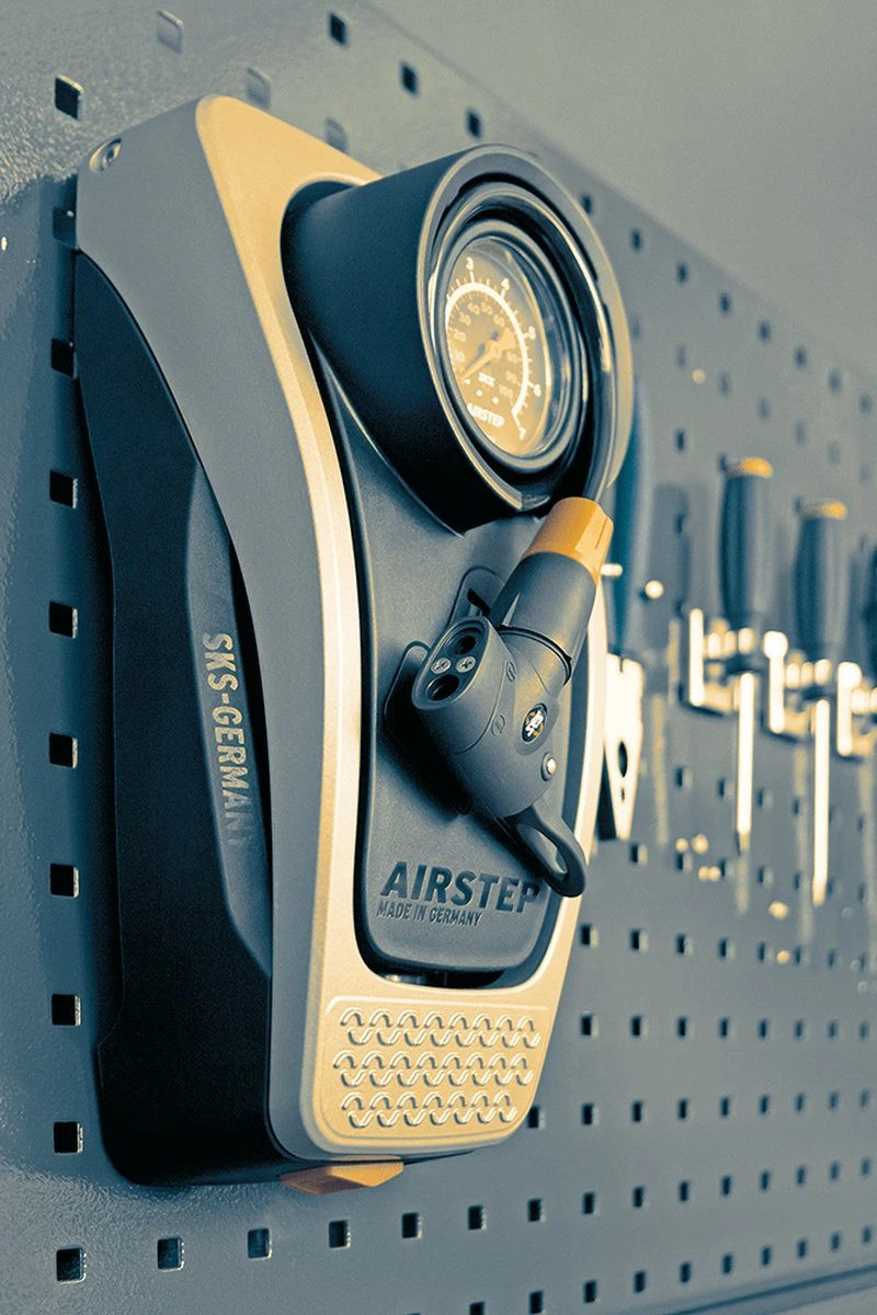 De voetpomp Airstep van SKS brengt de beste kwaliteiten van de klassieke voetpomp en de vloerpomp samen in één product. Met deze pomp heb je nooit meer last van je rug! Bovendien is het makkelijker om kracht te zetten omdat je met je voet pompt. De compacte pomp is makkelijk klein te maken en op te hangen aan de muur. Daarnaast heeft de pomp een grote, duidelijke manometer die zelfs vanaf grote hoogte goed af te lezen is. De pompkop is geschikt voor alle fietsventielen. De maximale output van 7 Bar maakt hem vooral geschikt voor stadsfietsen, cyclocrossers en mountainbikes. Maar ook voor tubeless-rijders op de racefiets is dit een prima pomp!