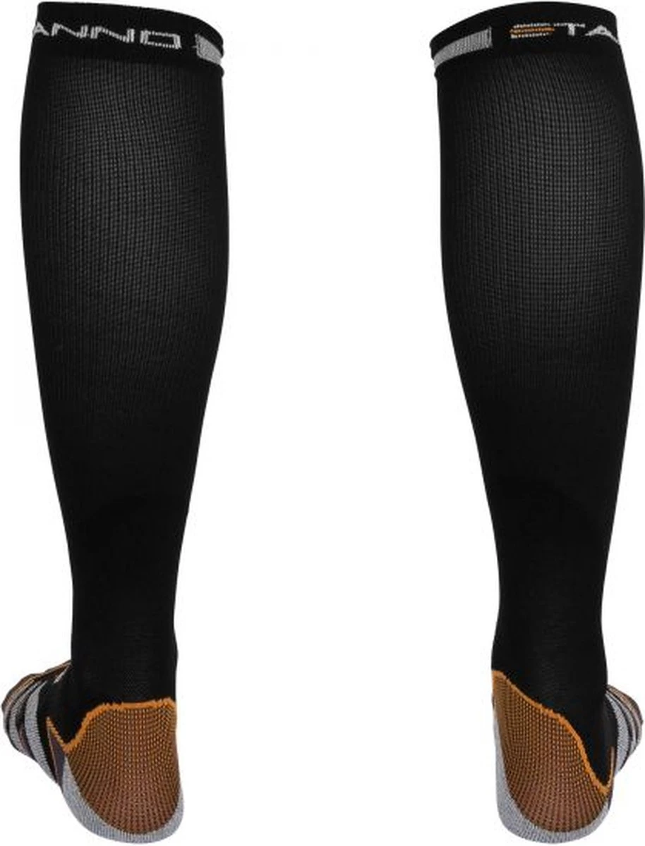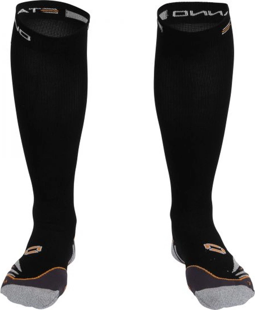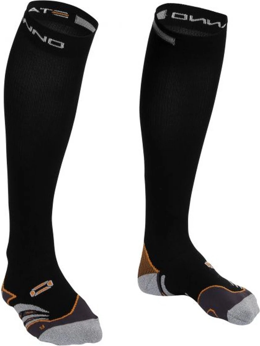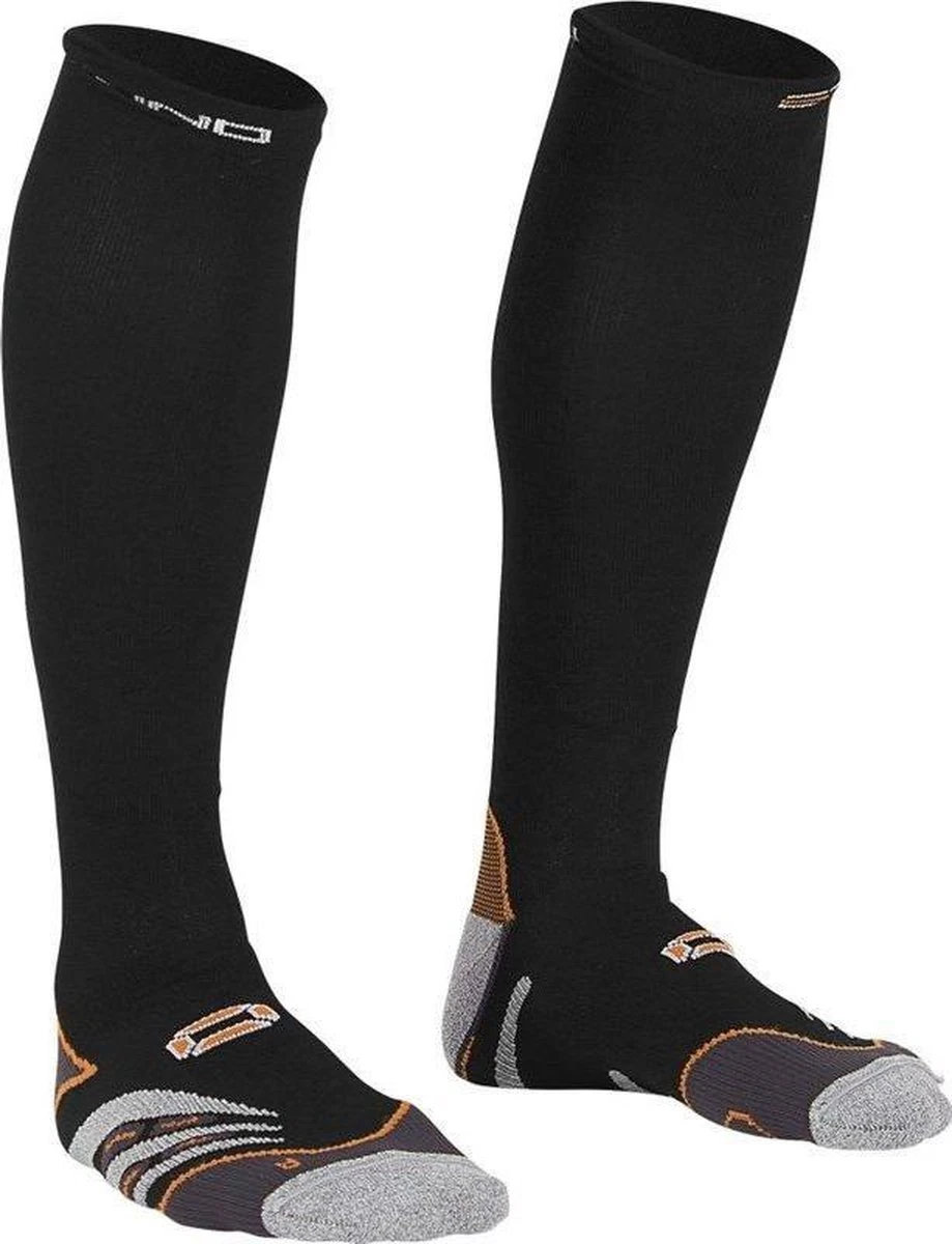 Compression Sock van Stanno in de kleur zwart, geschikt voor heren en dames. De druk die compressiekousen uitoefenen op het onderbeen levert bij verschillende sporten voordelen op. Zo wordt de bloedstroom naar het hart geoptimaliseerd en worden afvalstoffen die vrijkomen bij sportieve inspanningen optimaal afgevoerd. Tegen kuitklachten, spierverrekkingen en verkrampingen werken compressiekousen preventief. De naadloze hak en de tenen van deze compressiekous zijn gemaakt van Nanoglide-materiaal, om blaarvorming te voorkomen. De materiaalmix (97% polyamide, 2% elastan, 1% glass beads) zorgt voor optimale warmteregulering en vochttransport. De achterzijde van de kousen is voorzien van reflecterende garen.