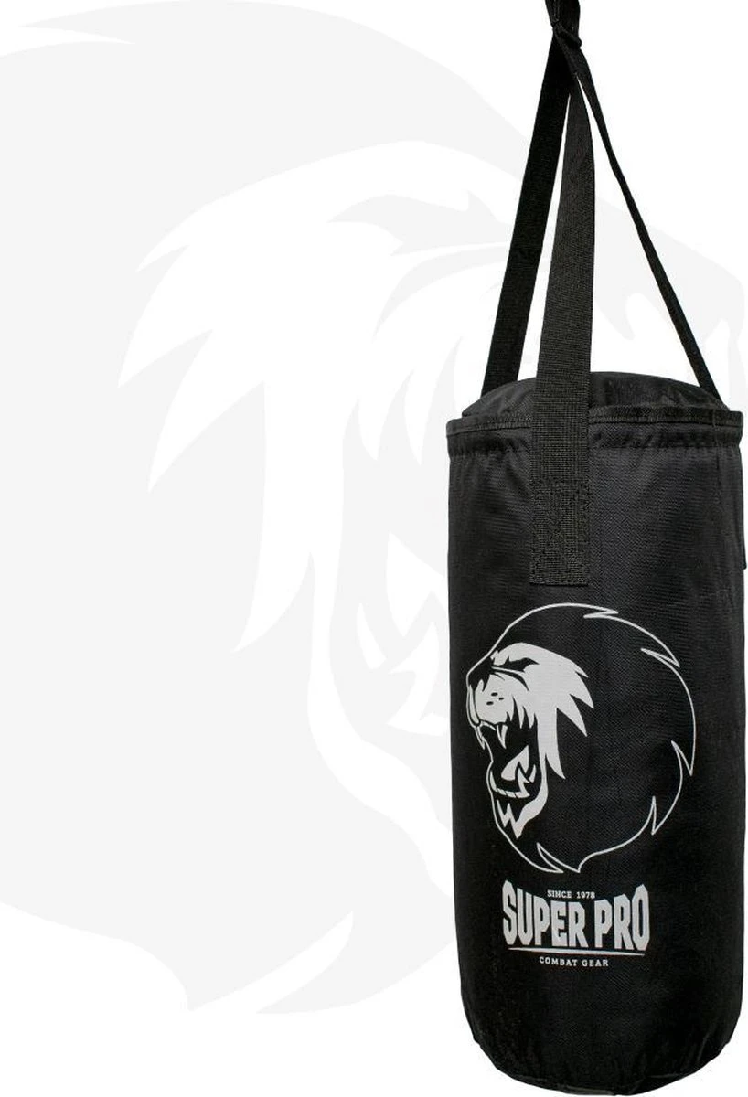 De Super Pro Combat Gear junior boksset bestaande uit een bokszak en een paar handschoenen. De bokszak heeft nylon hengsels waarmee u de bokszak makkelijk kunt ophangen. De bokszak is gemaakt van nylon wat gebruiksvriendelijk is en de vulling is van een katoen/canvas combinatie wat zorgt voor een mooi egaal gevulde bokszak en de stoten en trappen absorbeert. De bokszak is 43 x 19 centimeter. De bokshandschoenen gemaakt van zwart PU in 6 oz, hebben een fijne pasvorm en beschermen de handen en knokkels prima. Advies leeftijd van 4-8 jaar
