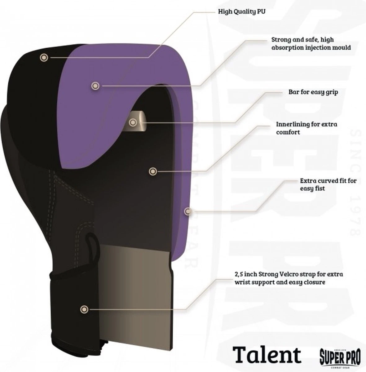 Deze (kick)bokshandschoenen zijn geschikt voor kinderen.De Super Pro Combat Gear Talent kickbokshandschoenen zijn geschikt voor thai/kickboksen, origineel boksen en K1.