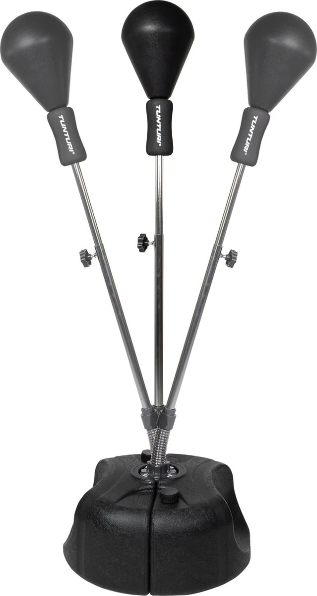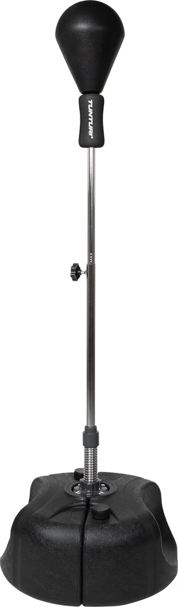 Door de voet te vullen met zand blijft de speedball altijd stevig op zijn plek staan, hoe hard je er ook tegen stoot of schopt. De bal zelf is gemaakt van PolyUrethaan (PU), een goed en sterk alternatief voor leer. De stalen stang is in hoogte aanpasbaar, zodat je altijd op de goede hoogte traint.