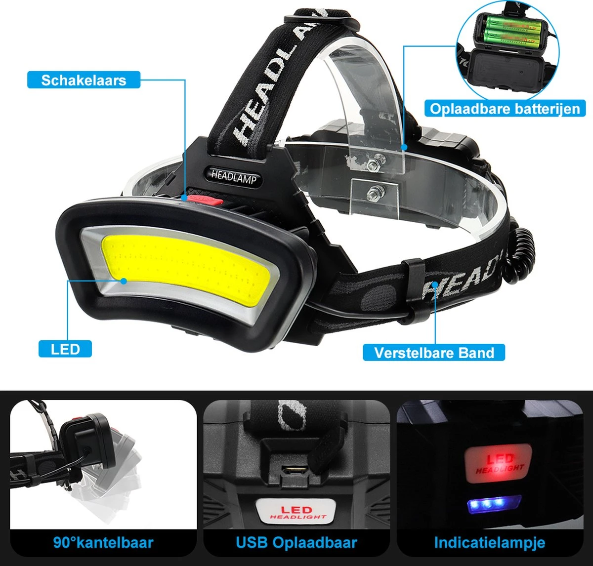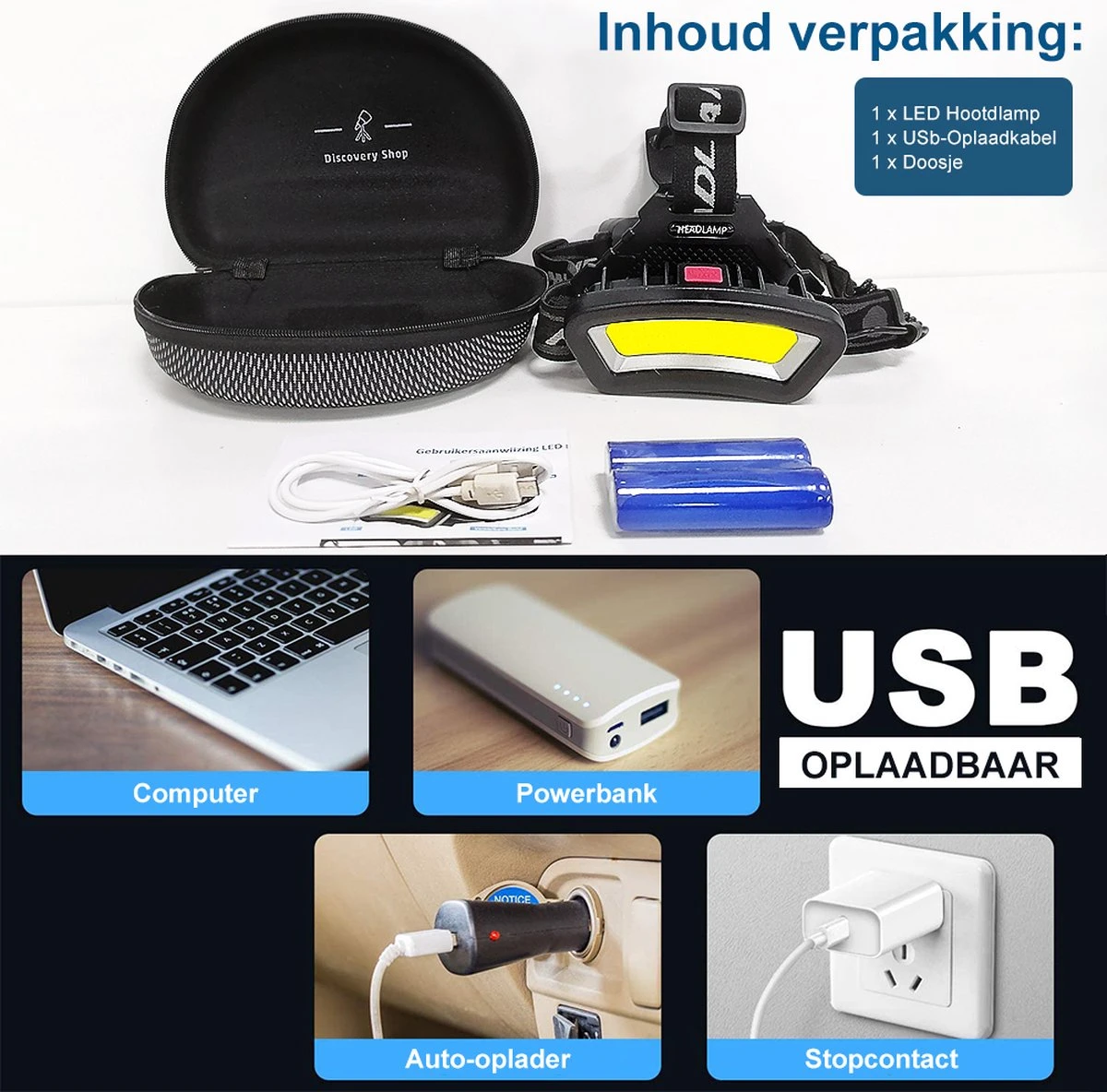 Deze militaire hoofdlamp met brede, ultrakrachtige LED-lichtbalk is USB oplaadbaar, waterdicht, compact met verstelbare hoofdband en dus geschikt voor alle soorten outdoor en indoor activiteiten. Deze set wordt geleverd inclusief USB-oplader en extra krachtige oplaadbare batterijen (totaal 5200 mAh) en is dus meteen klaar voor gebruik. Bestel hem nu meteen en profiteer van de uistekende service, 2 jaar garantie en gratis reparatie of vervanging door Discovery Shop!