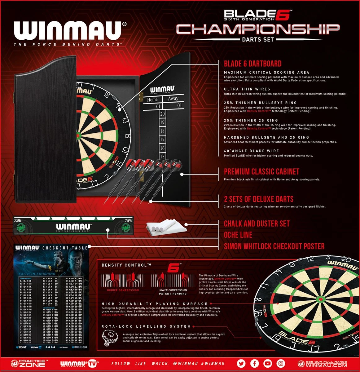 De Winmau Blade 6 Championship dart set is compleet, het heeft alles wat je nodig hebt voor een professioneel partijtje darts in de comfort van je eigen huis. De dart set bestaat uit een Blade 6 dartbord, een luxe dartkabinet met scorepanelen, een officiële oche line, 2 sets zwarte dartpijlen, een Simon Whitlock checkout poster, krijt en een wisser. Het premium dartkabinet is uitgevoerd in zwart en heeft een essen look, in +/- 60 cm hoog, 51 cm breed en 8 cm diep. Geopend is het Winmau dartkabinet +/- 102 cm breed.