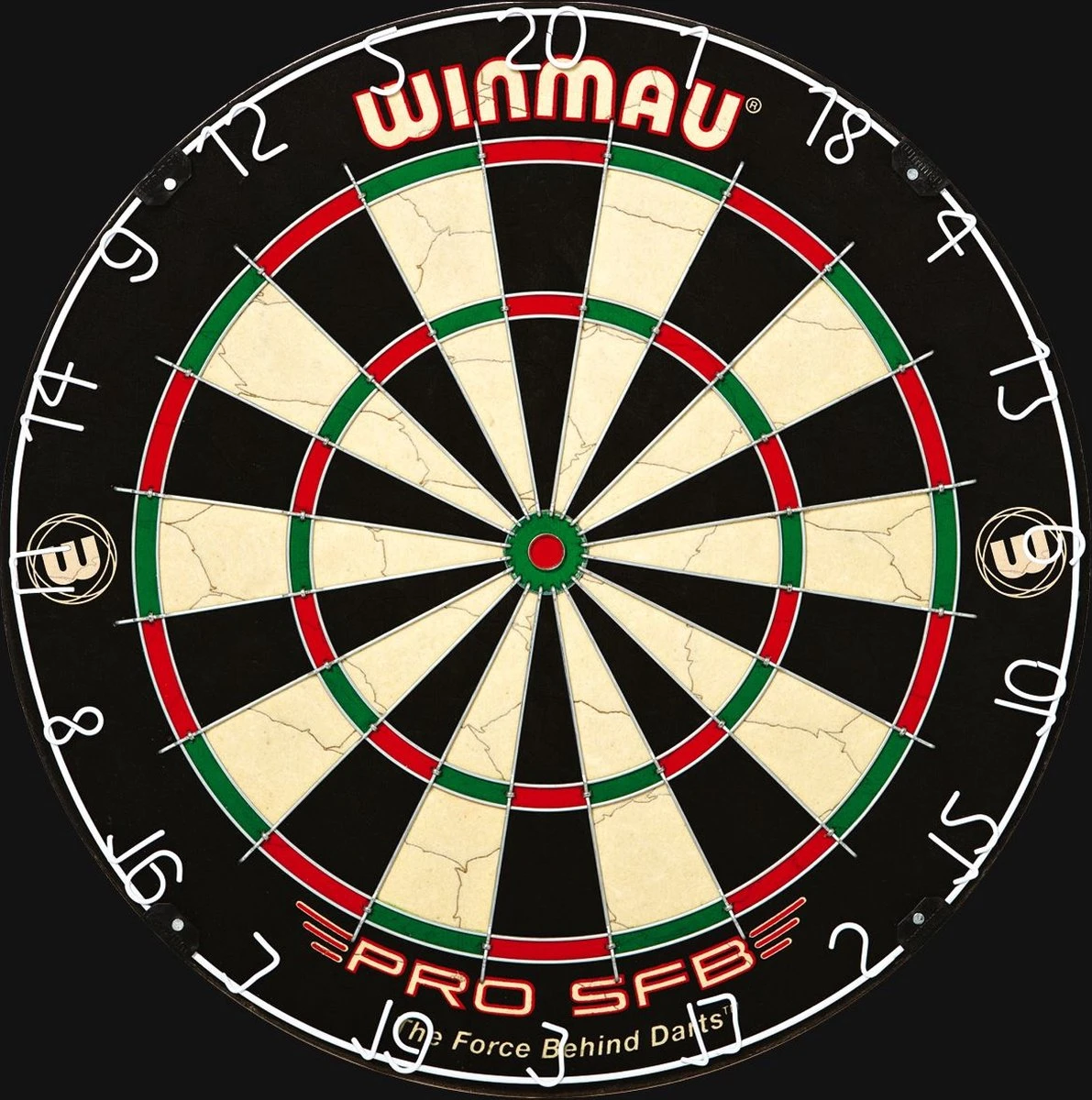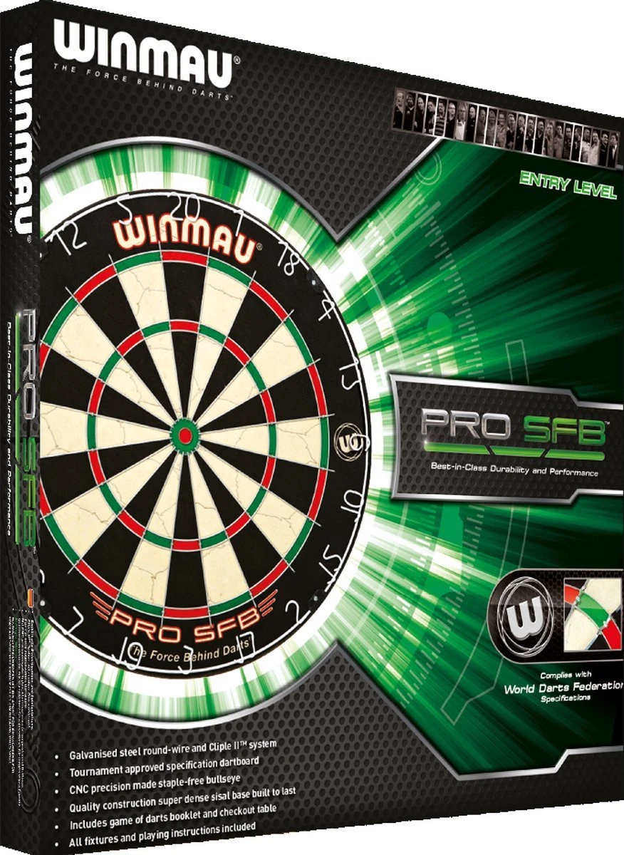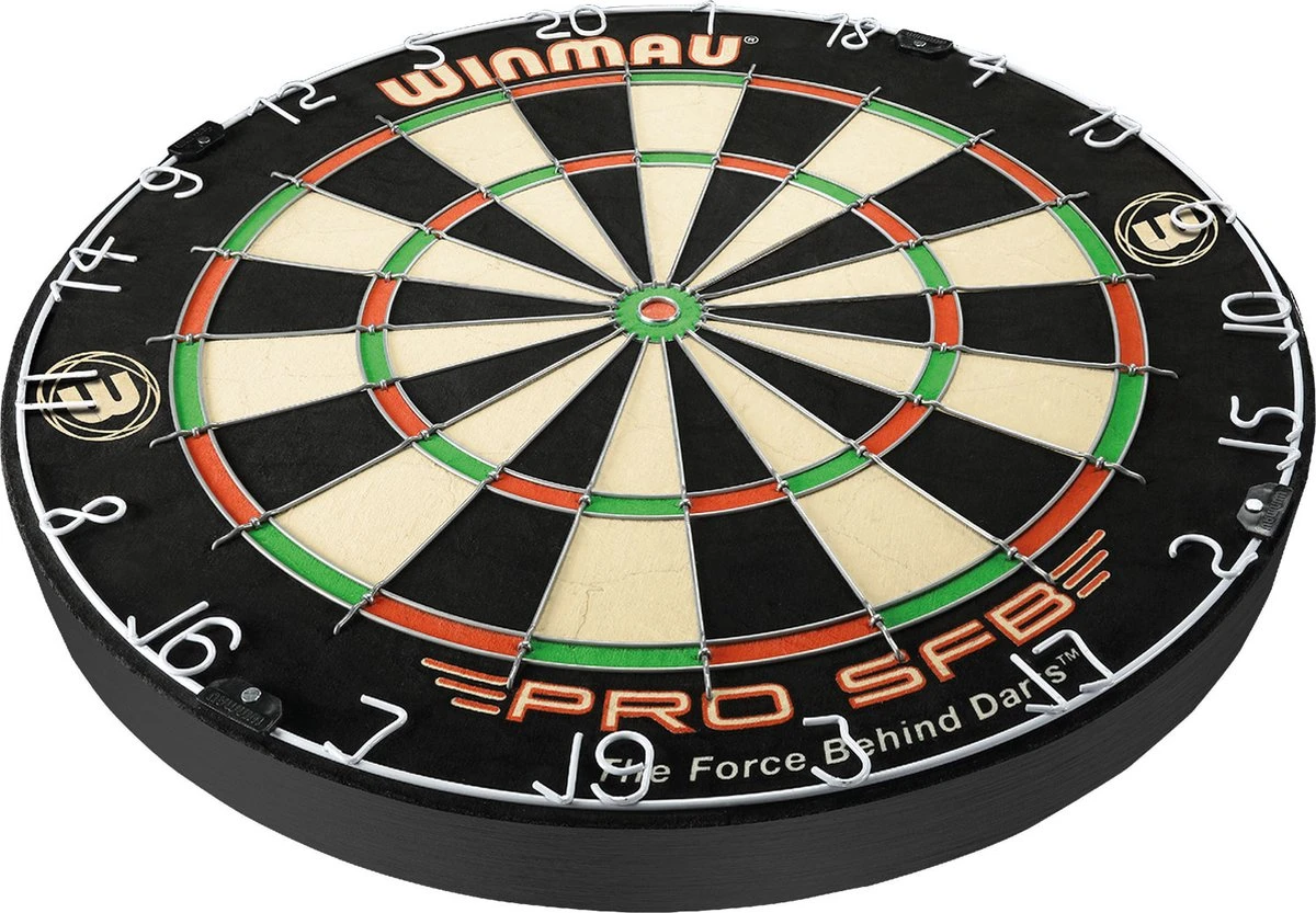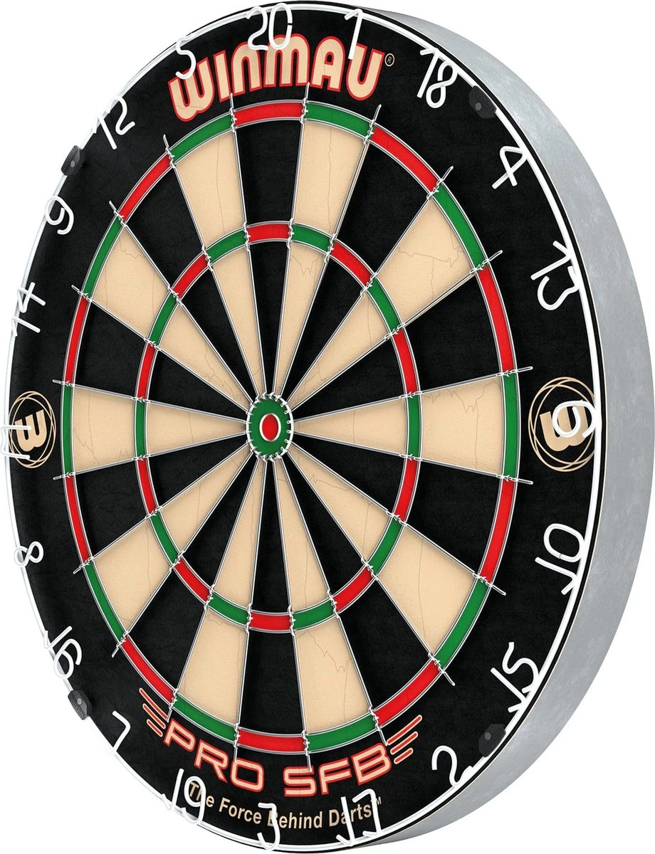 Dartbord Winmau Pro SFB. Sisal Bristle wedstrijdbord. Een Bristle dartbord wat ervoor zorgt dat de haren de gaatjes zelf dichten. Met een ronde draad. Met kramloze bull zonder bevestigingspunten zodat de pijlen minder snel afketsen bij de Bull. Met gelakte anti-glans nummer ring.