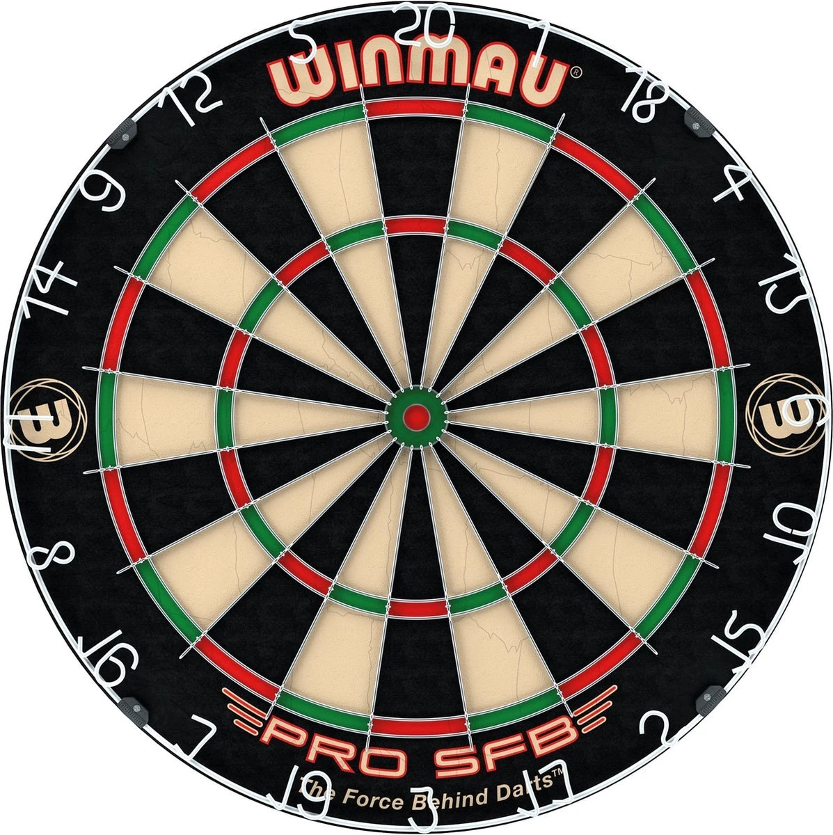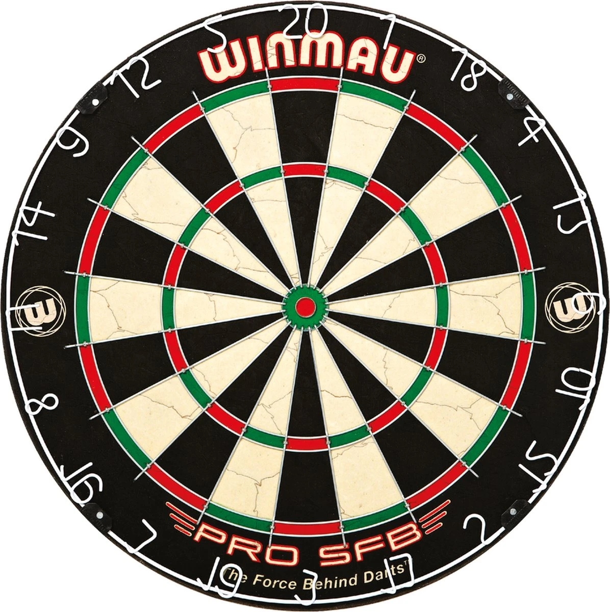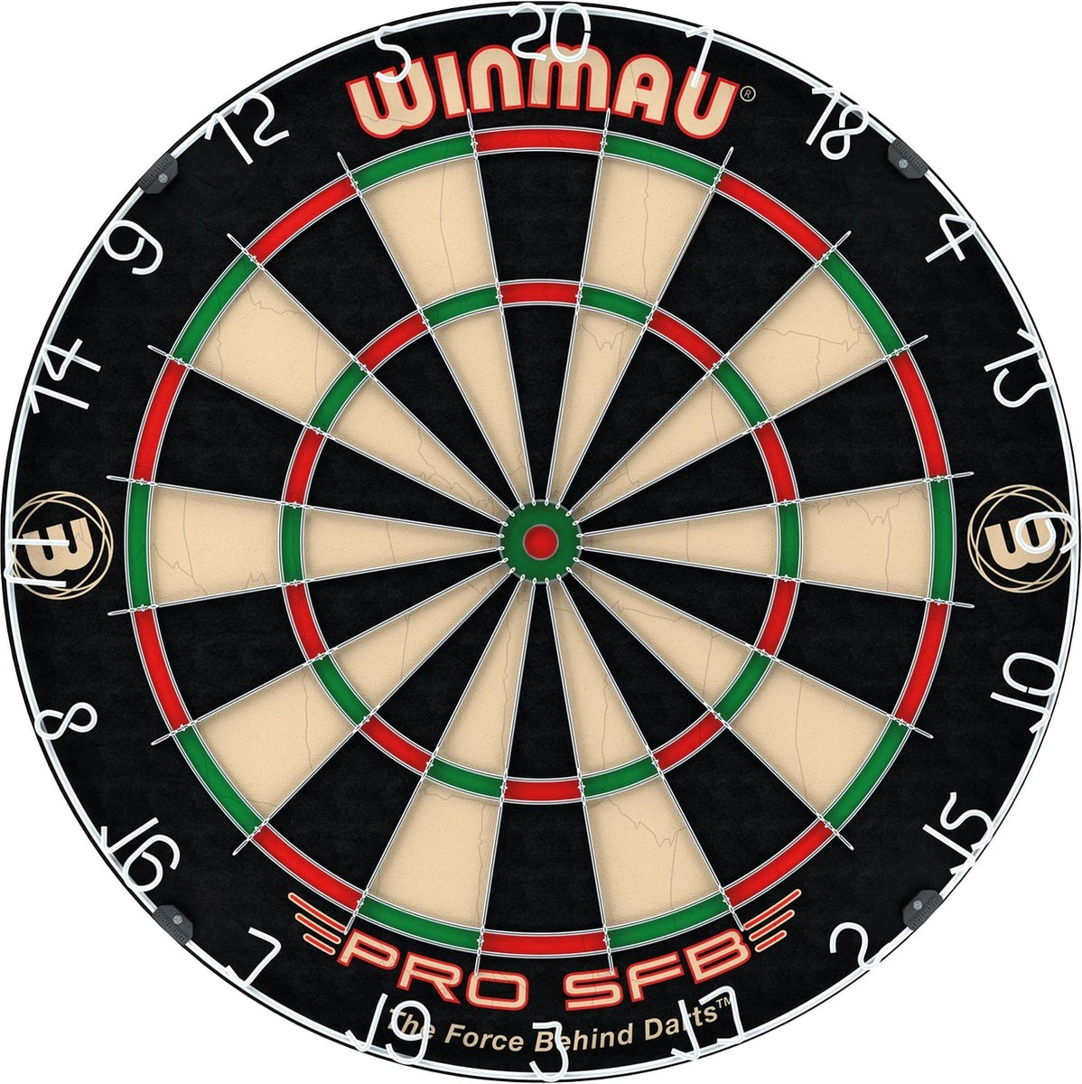 Dartbord Winmau Pro SFB. Sisal Bristle wedstrijdbord. Een Bristle dartbord wat ervoor zorgt dat de haren de gaatjes zelf dichten. Met een ronde draad. Met kramloze bull zonder bevestigingspunten zodat de pijlen minder snel afketsen bij de Bull. Met gelakte anti-glans nummer ring.