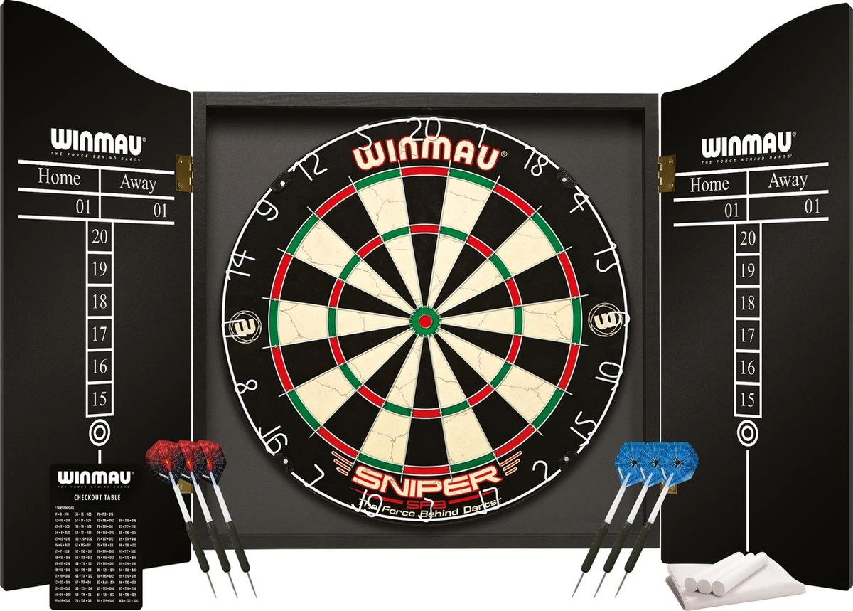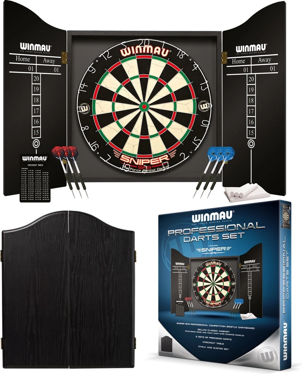 Met deze professionele dartset van Winmau heb je alles in huis om van je favoriete hobby een sport te maken! De set bevat een Winmau Sniper dartbord. De luxe zwarte kast heeft thuis- en uitscorepanelen in de deuren en een verstevigd achterpaneel. Inclusief 2 sets darts.