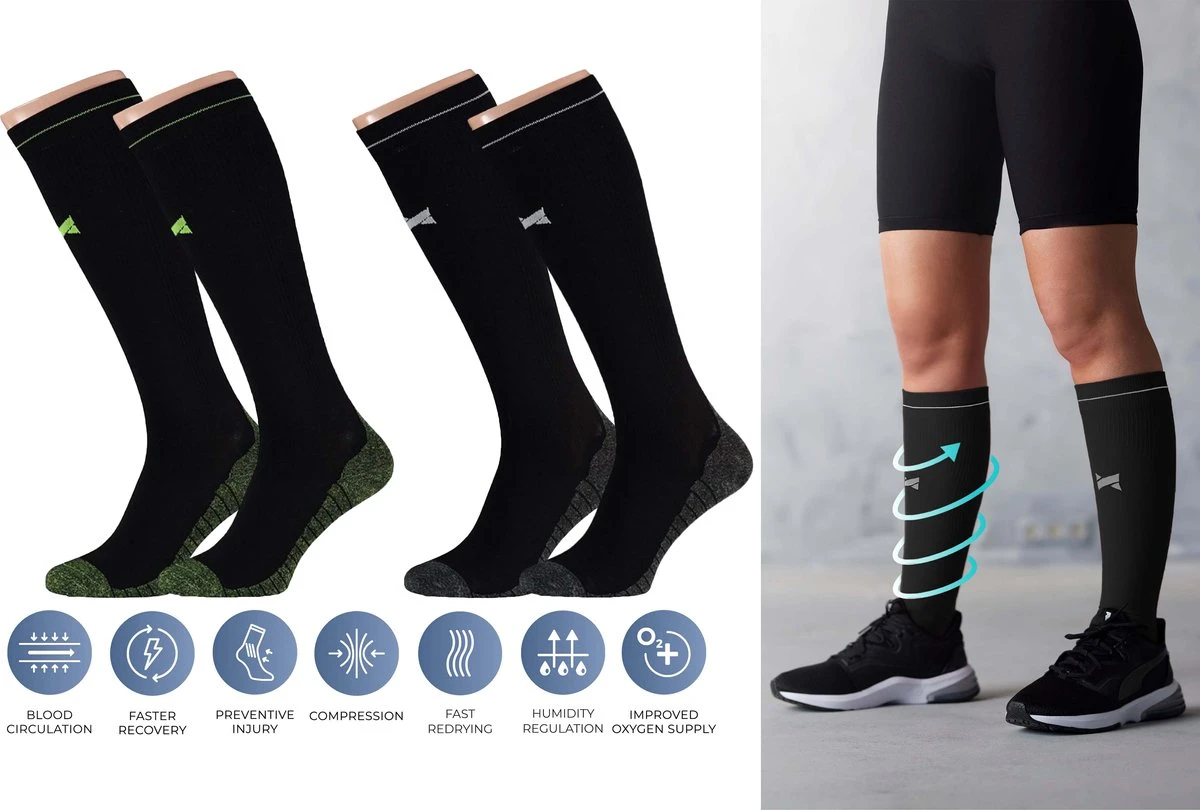 Voorkom vermoeide benen, opgezwollen voeten of blessures tijdens en na een werkdag, workout of lange reis. Met deze hoge compressiekousen blijft u vitaal en vrij van klachten.