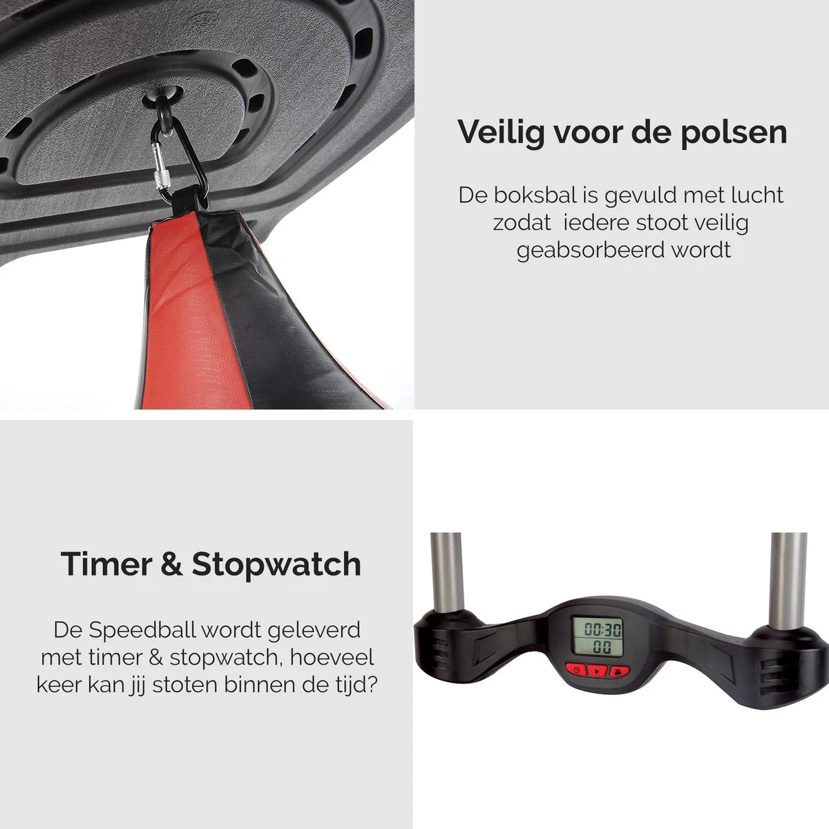 - Veilig voor de polsen – De boksbal met timer is veilig voor de polsen van je kind doordat deze gevuld is met lucht. Zo kan iedere stoot veilig geabsorbeerd worden.